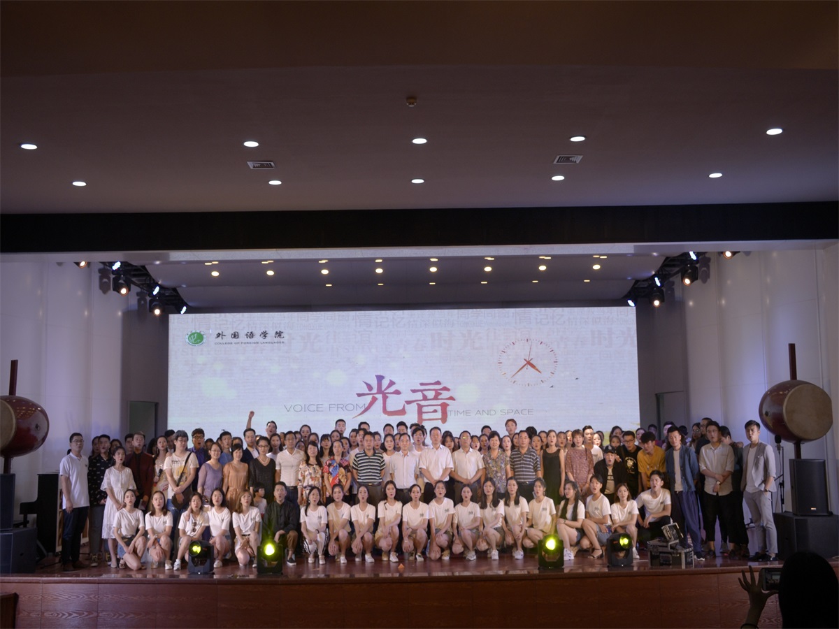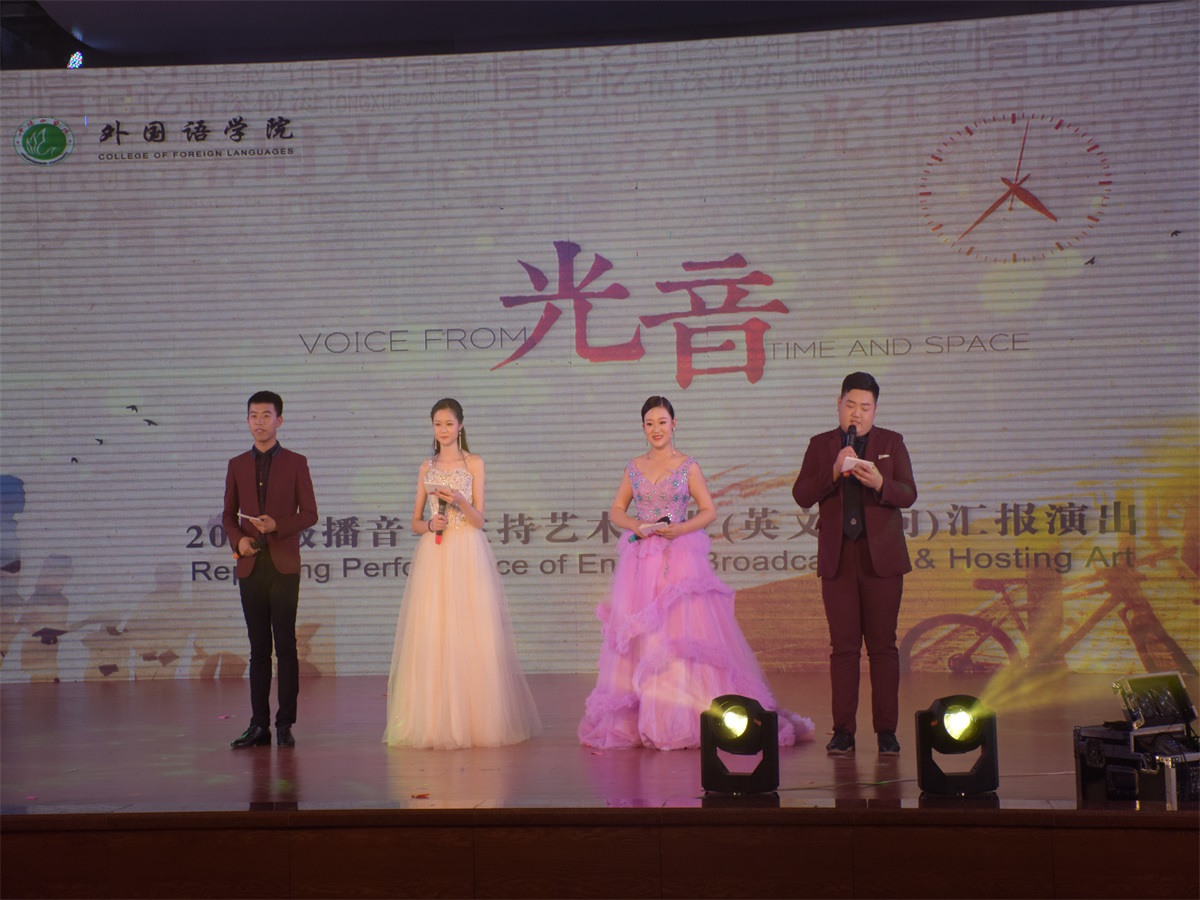 6月15日下午,由教务处、学工部、团委主办,122cc太阳成集团承办的2015级播音与主持艺术专业(英文方向)“光音”主题汇报演出在学校音乐厅举行。校领导袁桂娥、张久铭、李培、李波、于长立及各相关单位负责人与师生共500余人观看了此次汇报演出。