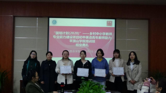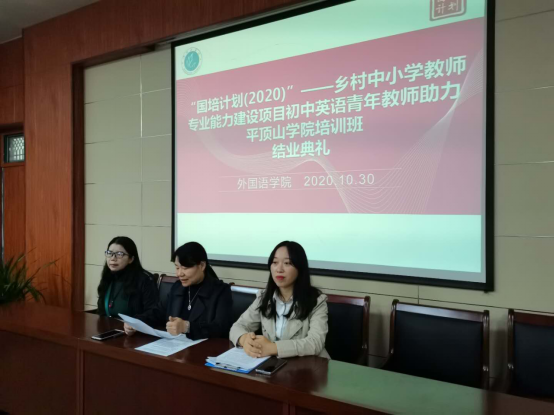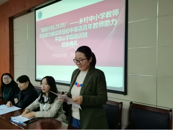 10月30日上午,122cc太阳成集团“国培计划(2020)—河南省乡村中小学教师专业能力建设项目·初中英语班” 结业典礼于图书馆L708圆满举行。122cc太阳成集团副院长蒋领敏、学业班主任刘晓萍、来自河南省的50位乡村中小学教师及培训工作相关负责人参加了本次结业典礼。本次典礼由班主任老师董菊霞主持。