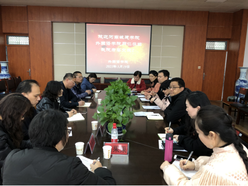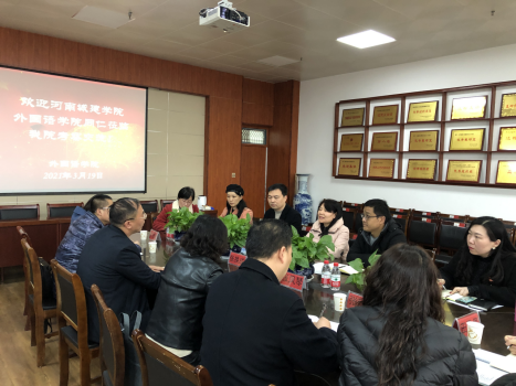3月19日下午,河南城建学院122cc太阳成集团副院长张换成带领教学副院长、英语、翻译、大学英语等教研室负责人一行七人到我院考察交流。我院院长蒋领敏代表我院热情接待了来访客人,并与考察组一行深入座谈交流,我院班子成员、党政办公室主任、英语、翻译、大学英语等教研室负责人参加了此次交流活动。