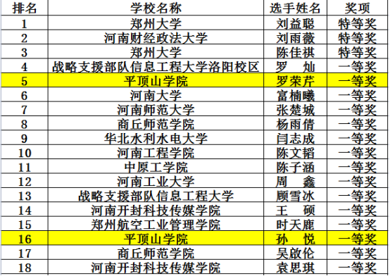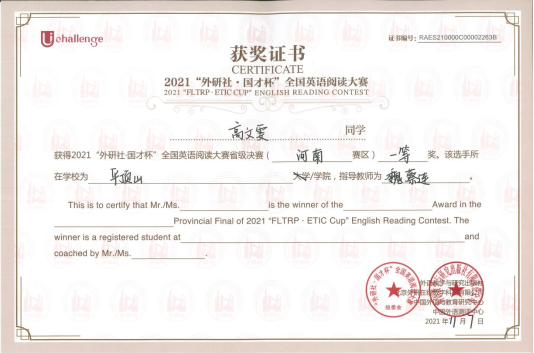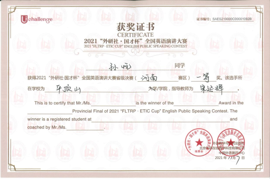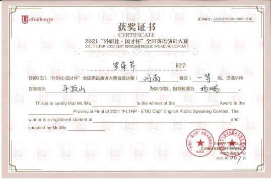 近日,从“外研社·国才杯”河南省赛组委会获悉,我校8名选手在2021“外研社国才杯”全国英语演讲、写作、阅读大赛省级决赛中,不惧挑战、沉着应对,夺得了一等奖3项、二等奖5项,取得了我校自2017年参加该系列赛以来的最好成绩,充分展现了平院学子的风采。