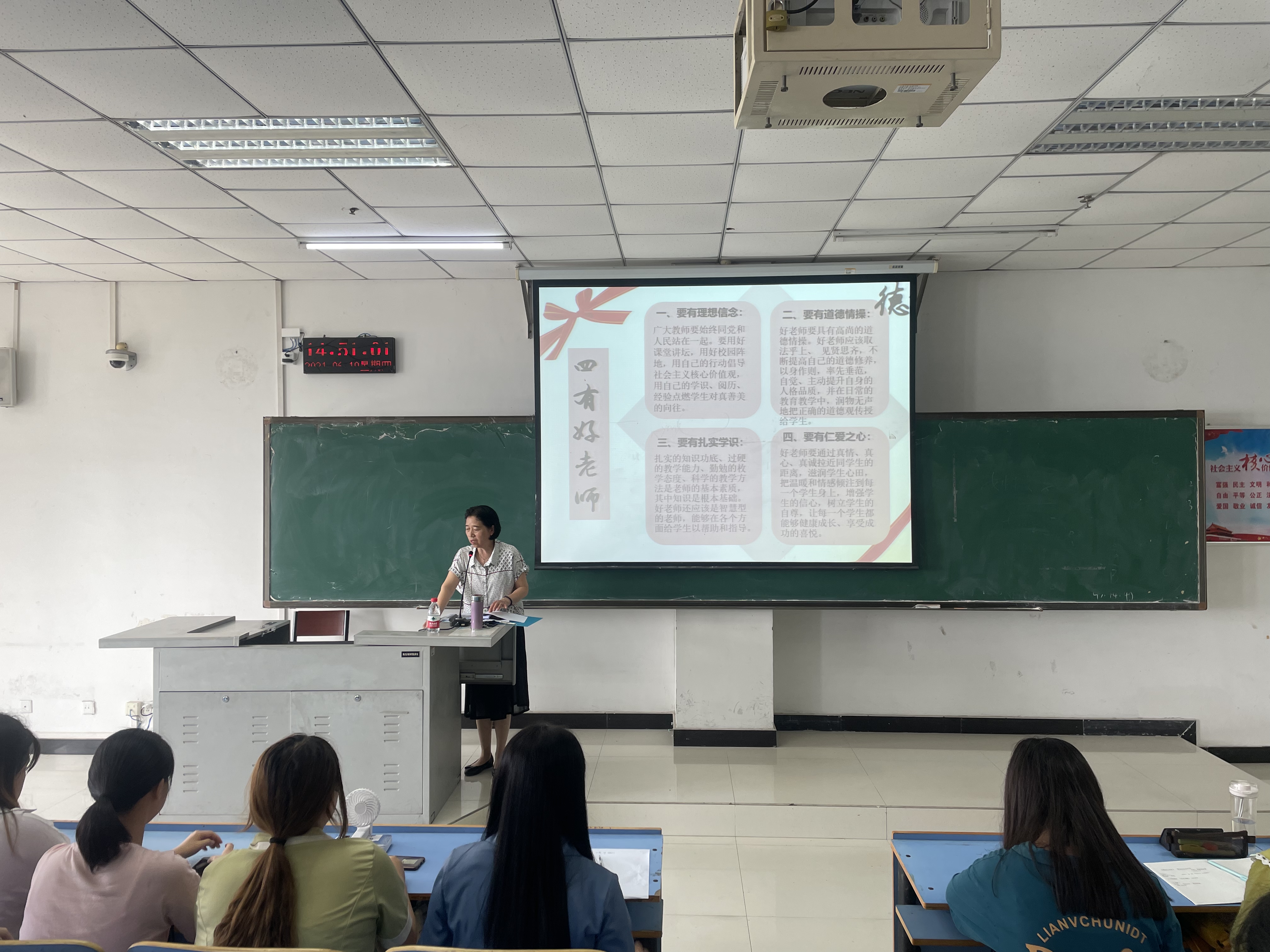 单满菊教授首先向同学们讲述了职业道德及师德的有关概念,由道德引述到师德,并向大家介绍了“四有好老师”的内容,即要有理想信念、要有道德情操、要有扎实学识、要有仁爱之心,为同学们的未来教师职业生涯提供了重要的指引。接着,单满菊教授向同学们展示了新时代我国教师职业道德要求及中小学教师职业道德规范,并结合相关案例和自身工作经历,深入浅出地向同学们讲述了师德的重要性。随后,单满菊教授又提出了师范生必备的三个基本功,她叮嘱同学们要把握好教育的惩戒尺度,教会学生自我管理的方法,建立与家长沟通的有效方式,使同学们收获了相关教学经验。讲座最后,单满菊教授提出了她的教育准则,人品第一、态度第二、能力第三,进一步提高了同学们对师范教育的认识。