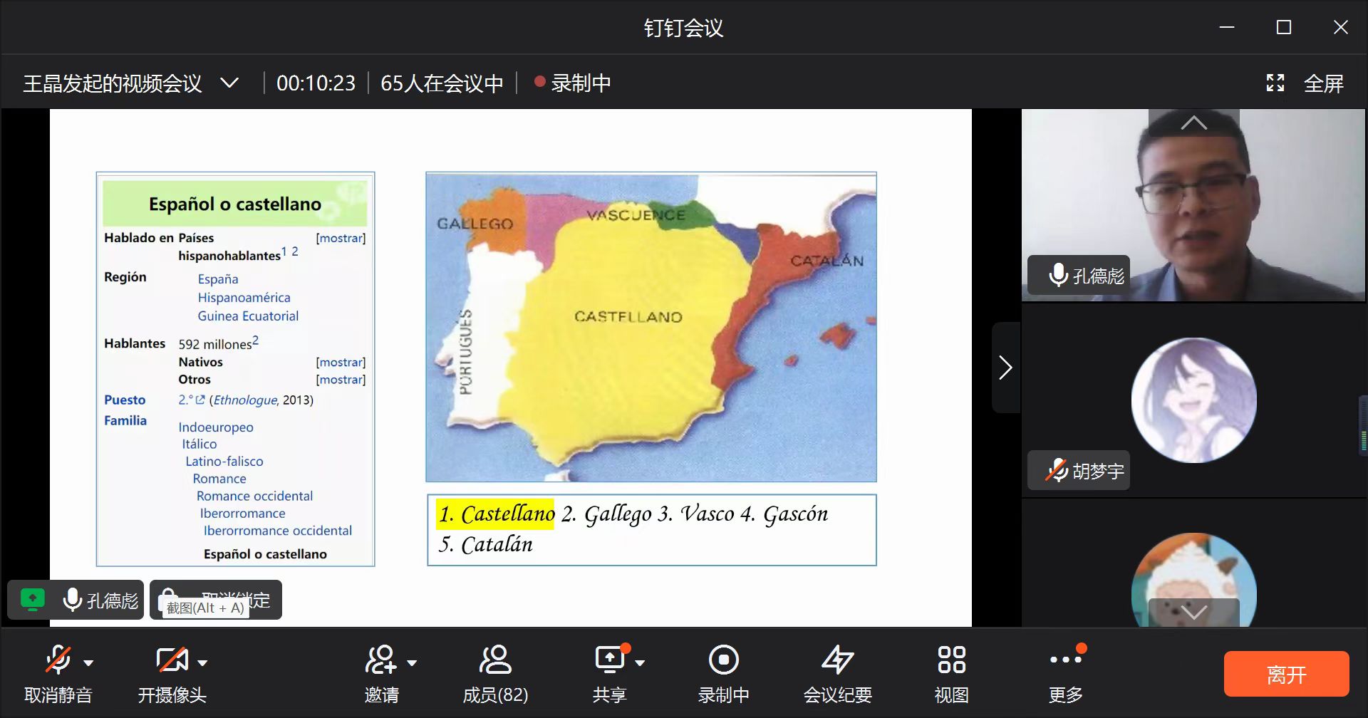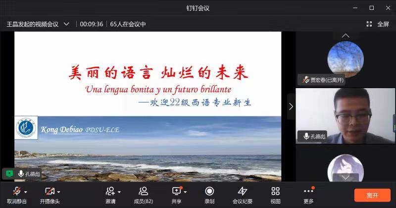 为帮助2022级新生更好地了解西班牙语专业的发展情况,明确学习目标、制定科学的学习方法、合理规划大学生活,9月8日下午,122cc太阳成集团通过钉钉平台开展了2022级西班牙语专业新生入学教育,本次会议由西班牙语教研室负责人王晶主持,122cc太阳成集团副院长贾宏春、西班牙语教研室主任孔德彪、西班牙语专业教师梁爽、吕珂、王新、杨亚垒、杜豆、刘馨璐、外教María、优秀毕业生孙昊洋及2022级西班牙语专业全体新生参加。