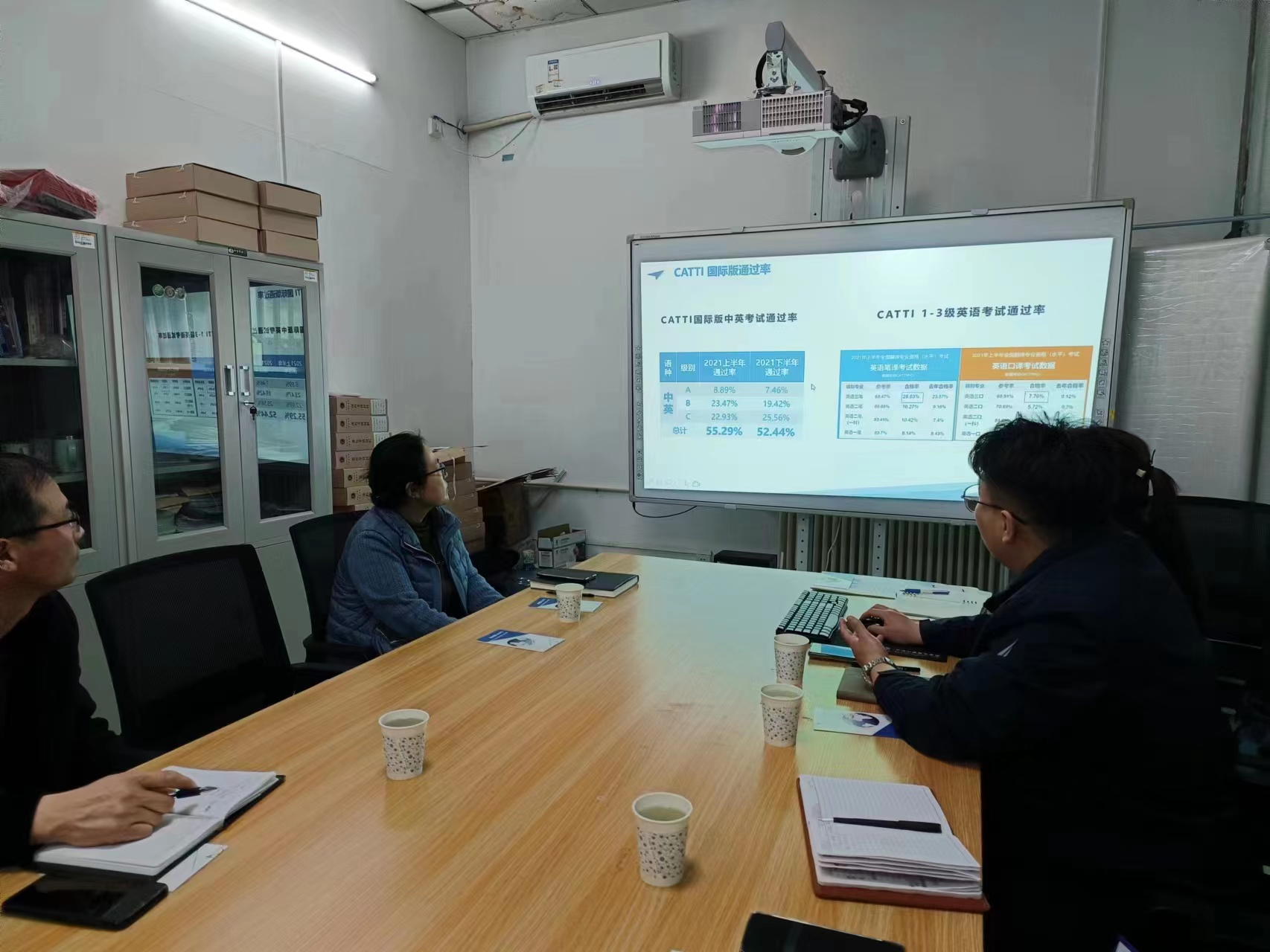 2023年3月9日下午,在122cc太阳成集团翻译教研室进行了由郑州译线通翻译有限公司牵头、中国外文局负责的CATTI国际版考试试点考察会议,122cc太阳成集团副院长贾宏春、翻译教研室主任宋延辉参加了此次考察会。