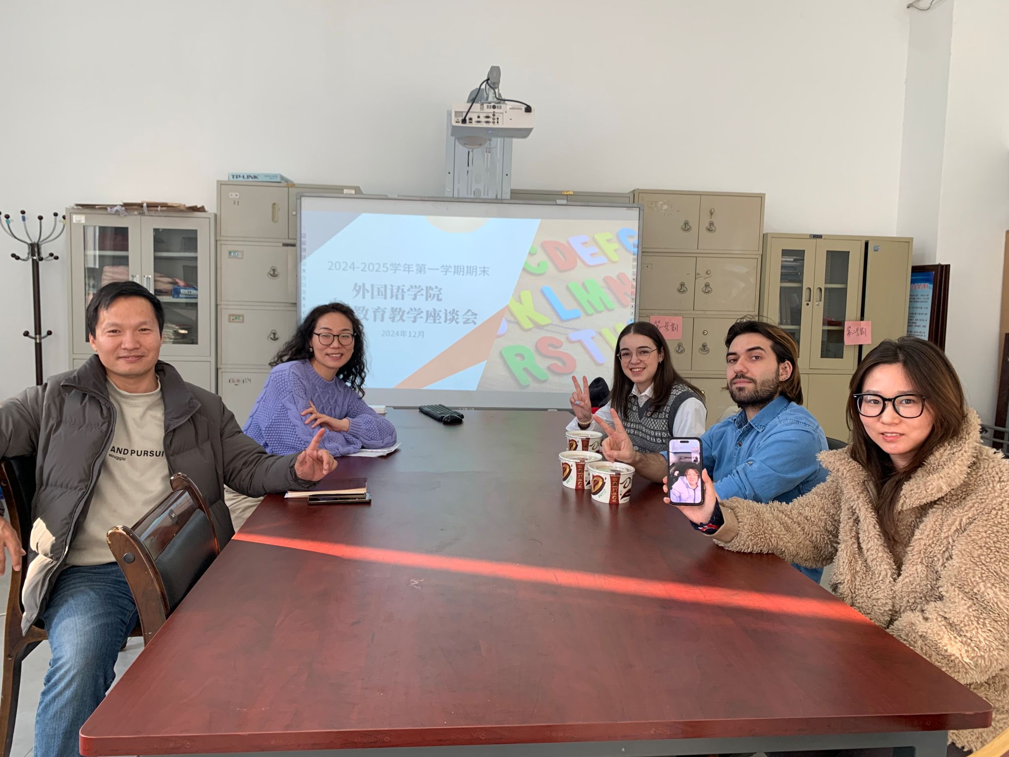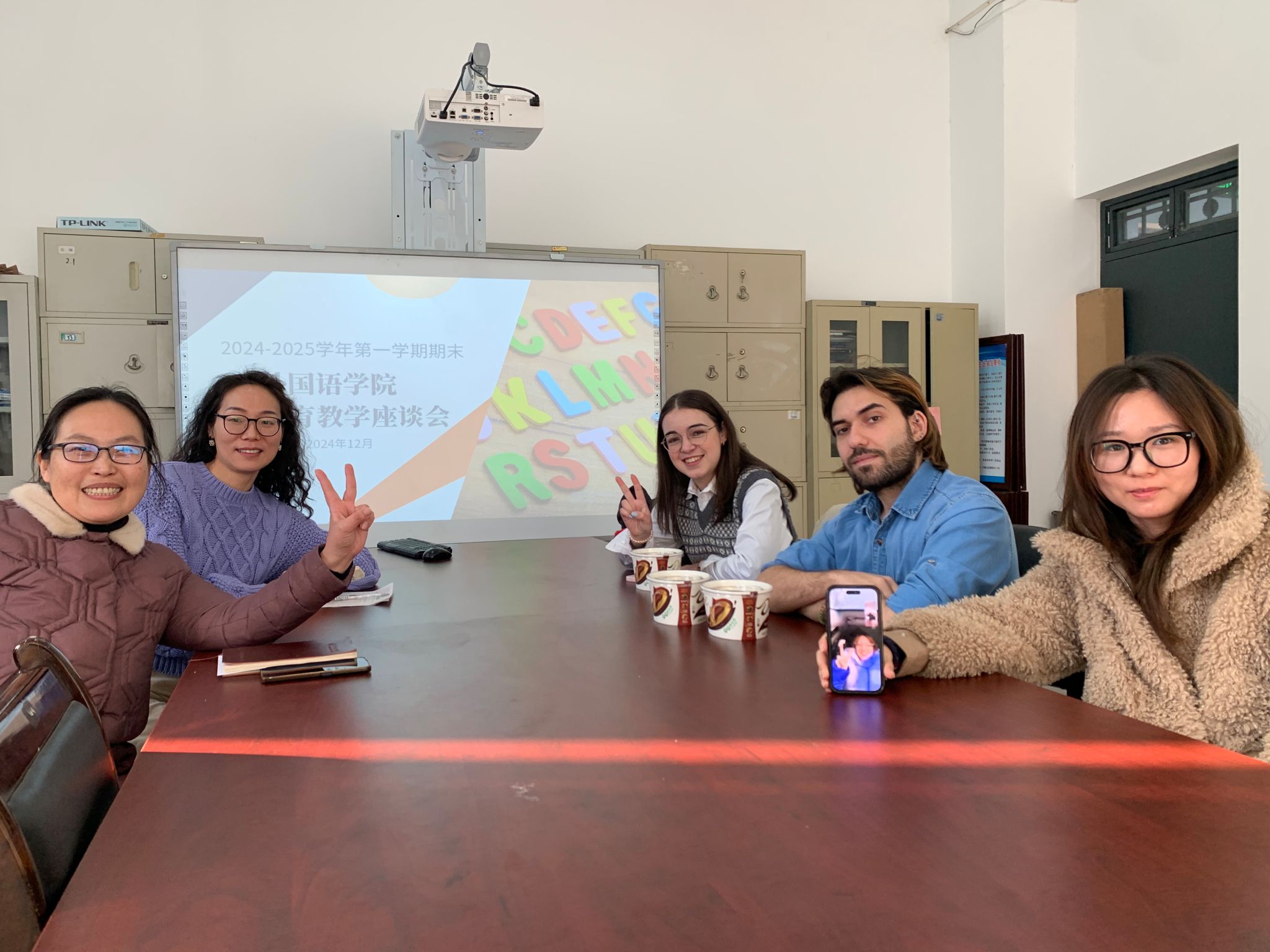 2024年12月19日下午3点,122cc太阳成集团在文科楼RB105室举办了学期期末外籍教师教育教学座谈会,旨在促进中外教育交流,提升教学质量。出席本次座谈会的有122cc太阳成集团副院长贾宏春、外籍教师Fatima、Maria与Nicolas,以及外教合作教师郭晓燕、郭春园和肖子钰老师。