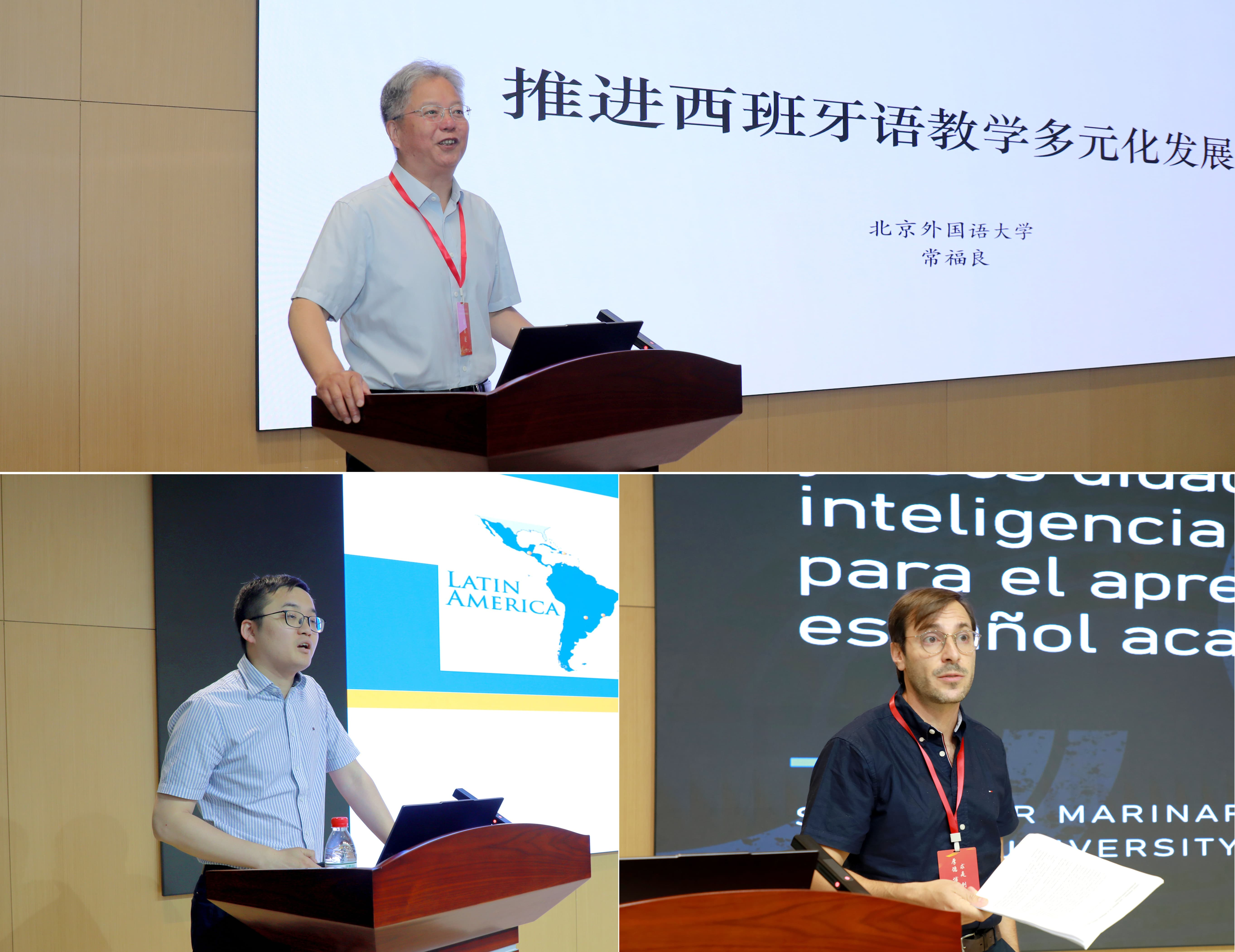 在大会主旨报告环节,北京外国语大学常福良教授、中国现代国际关系研究院南南合作研究中心副主任严谨博士、首都师范大学122cc太阳成集团副院长廖菡博士,山东大学西班牙语系主任张沁园博士,复旦大学阿根廷籍教师萨尔瓦多·马里纳罗(Salvador Marinaro)、西班牙马拉加大学哲学与文学院院长萨拉·罗贝兹(Sara Robles)教授、阿根廷马德普拉塔国立大学教师加布里埃拉·阿努兹(Gabriela Arnuz)、墨西哥国立自治大学教师卡塔利·娜加西亚(Catalina García)、我校西班牙籍教师法蒂玛·玛丽亚(Fátima María)、尼古拉斯·布埃诺(Nicolás Bueno),围绕大会主题,进行了主旨报告。报告围绕倡导西语教学多元化发展、拉美研究与教学协同创新路径、聚焦AI驱动的多语种教育一体化建设、探索跨文化交际能力培养新范式、剖析AI在学术西语的教学张力、开发数字媒体标题作为西语教学资源、构建AI包容性课堂、强调数字与知识融合创新、解析“一带一路”背景下区域国别研究等,指向技术赋能、跨域融合、文化互鉴的西语教育变革方向。