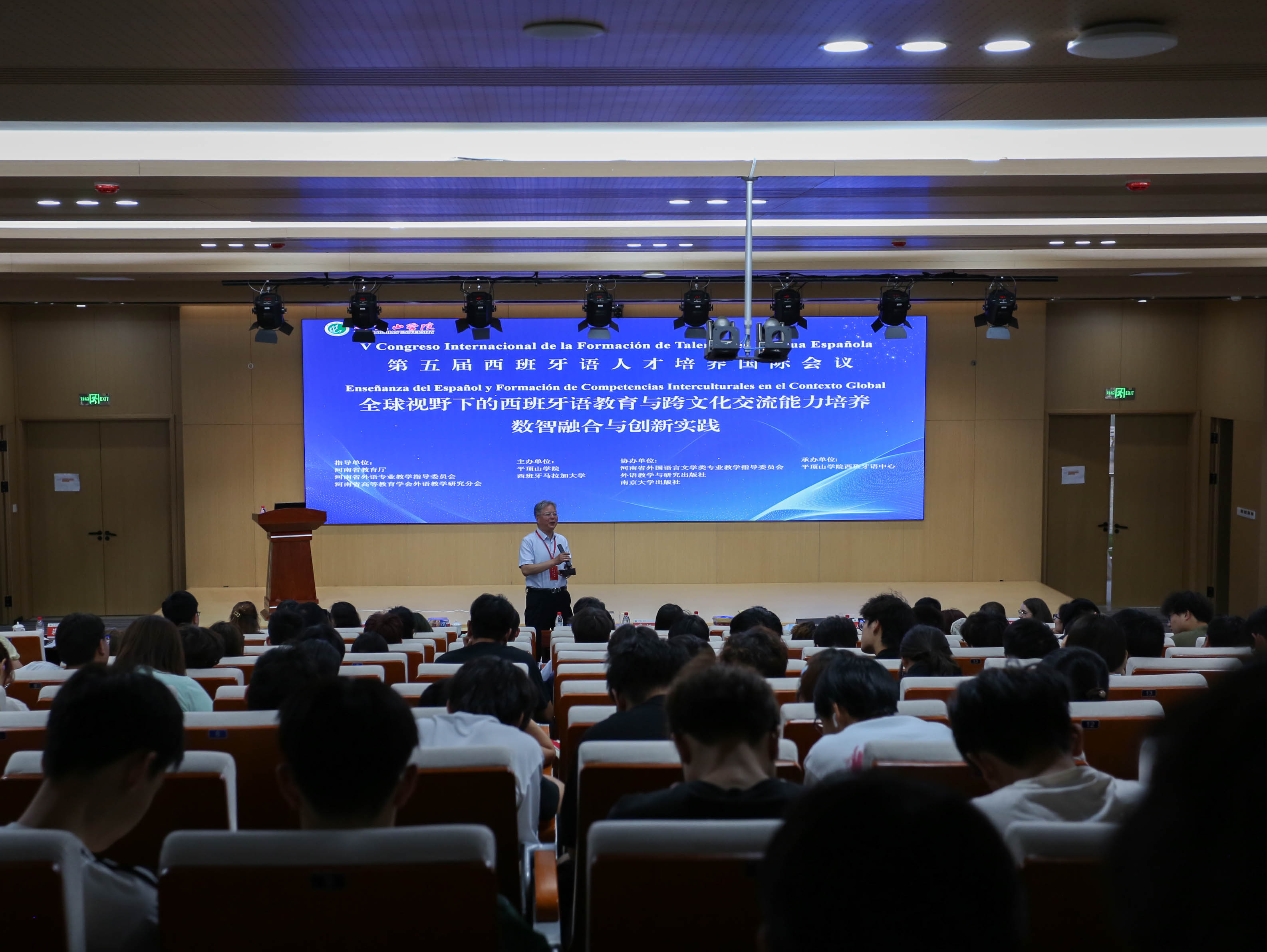 西班牙马拉加大学全权代表胡安·卡洛斯先生通过视频致辞。他指出,在科技革新与全球化深度交织的时代背景下,本届主题具有深远意义。会议既探讨当下热点,更将前瞻西班牙语教育的未来,为全球西语人才培养注入创新动能。