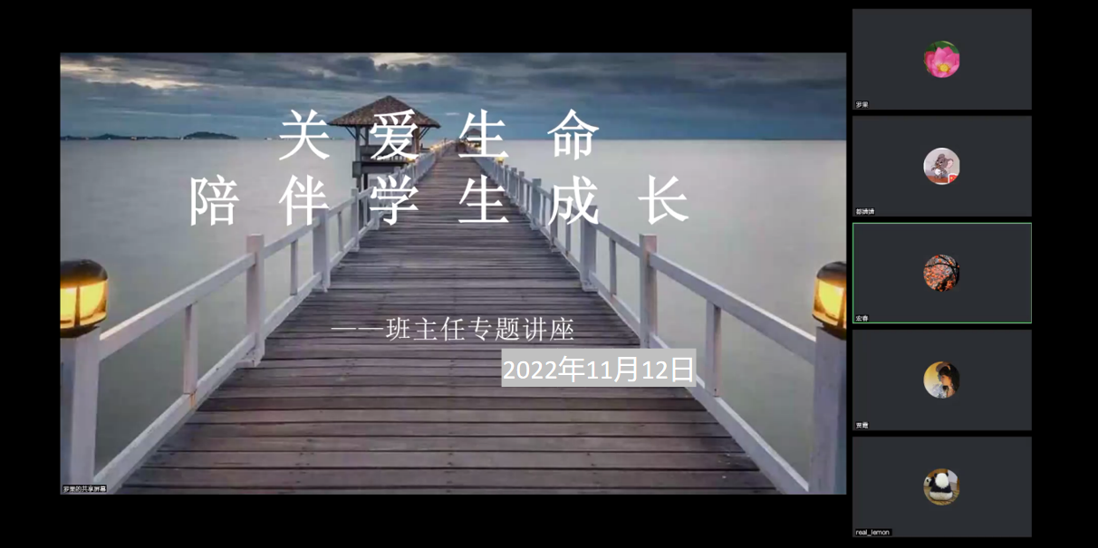 2022年11月12日,122cc太阳成集团邀请平顶山第二高级中学副校长罗果,给英语专业师范生做了一场“关爱生命,陪伴学生成长”的线上讲座。罗校长以班主任工作为视角,以生命教育为切入点,用一个又一个感人的案例,娓娓道来,讲述了班主任的工作职责,她指出班主任管理要有爱,要用正确的态度关爱学生,“偏爱学困生”、“严爱优等生”、“博爱中学生”,强调了关爱教育的重要性,与会师生深受感动,收获满满,对中学班主任工作有了更为深刻的认识。会后,贾宏春副院长对此次讲座进行了总结。此次讲座针对性强,内容丰富,对师范生培养职业责任感、提升职业素养、发展职业技能具有重要意义,对我院英语专业人才培养具有积极的推动作用。