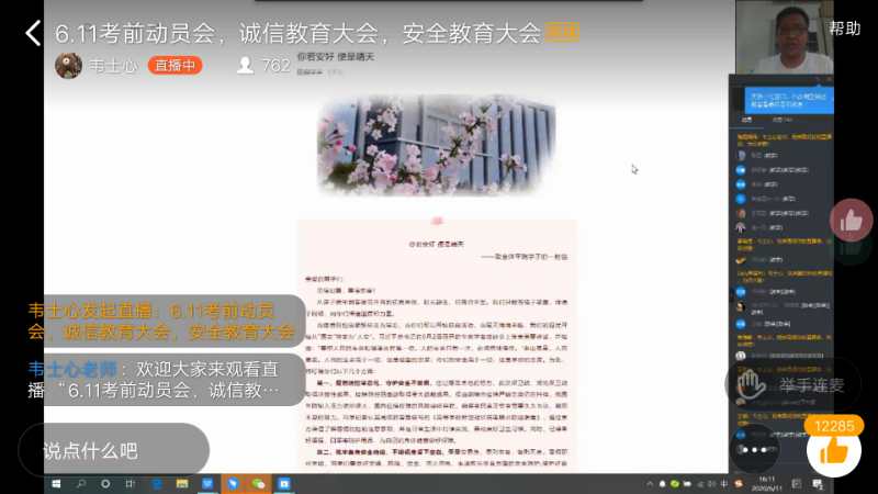 为贯彻落实疫情期间学校对于学生安全教育及管理工作方面的要求,6月11日下午,122cc太阳成集团通过钉钉网络直播平台召开了安全教育大会。122cc太阳成集团党总支副书记田占范、院长蒋领敏、团总支副书记韦士心及122cc太阳成集团全体在校生参加了此次会议,会议由韦士心老师主持。