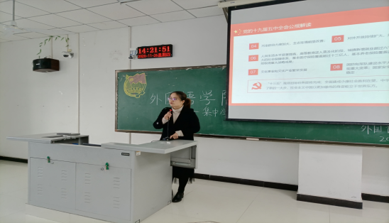 为了推动全院同学深入学习贯彻党的十九届五中全会精神,带领学生解读学习十九届五中全会公报内容。11月26日下午,122cc太阳成集团在图书馆411举行了十九届五中全会宣讲会。122cc太阳成集团团总支书记袁立文老师对全体学生进行了集中宣讲。