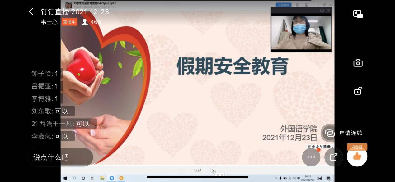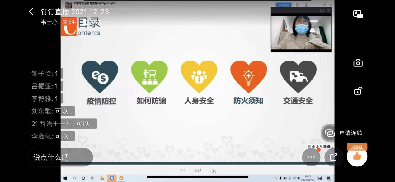 为巩固疫情防控工作成效,增强同学们的安全防范意识,提高同学们的安全防范能力,全力保障学生度过一个安全、愉快、充实的假期,12月23日,122cc太阳成集团通过钉钉平台开展了假期安全教育会。122cc太阳成集团辅导员韦士心以及全院学生参加了本次会议。