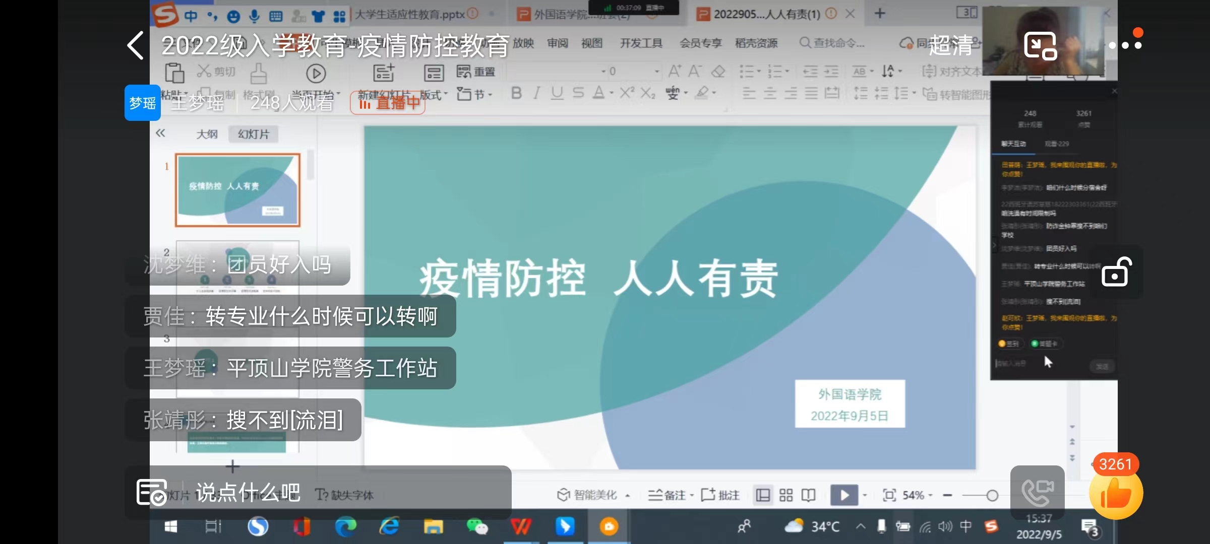 为进一步做好2022级新生开学前的疫情防控工作,增强同学们的疫情防控意识,保障新生顺利开学。9月5日下午,122cc太阳成集团通过钉钉平台开展了2022级新生疫情防控教育大会,本次大会由122cc太阳成集团辅导员王梦瑶主持,122cc太阳成集团2022级全体新生参加。