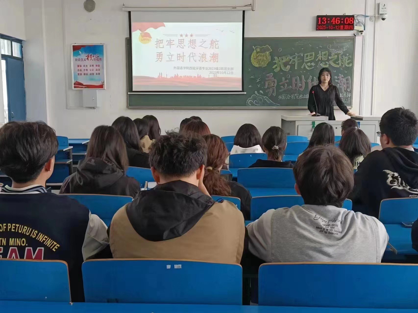 为深入学习习近平新时代中国特色社会主义思想,引领广大青年学生不断提升思想道德素质和法治素养,展现青年奋发进取的精神面貌,10月12日下午,122cc太阳成集团团委各支部通过线上线下相结合的方式开展了以“把牢思想之舵,勇立时代浪潮头”为主题的团日活动。本次团日活动由各支部团支书主持,122cc太阳成集团全体学生参加。