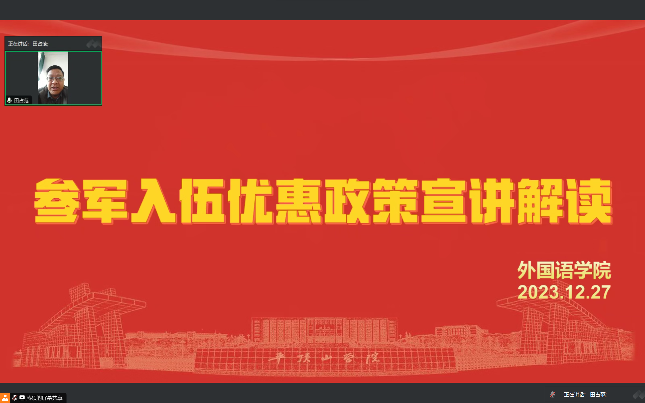 为积极响应国家征兵号召,进一步深化大学生对征兵工作的理解和认识,激励更多的学生主动参军入伍,12月27日上午,122cc太阳成集团于线上召开了参军入伍优惠政策宣讲会。本次宣讲会由122cc太阳成集团党委副书记田占范和2020级辅导员黄硕主讲,122cc太阳成集团2020级全体学生参加。
