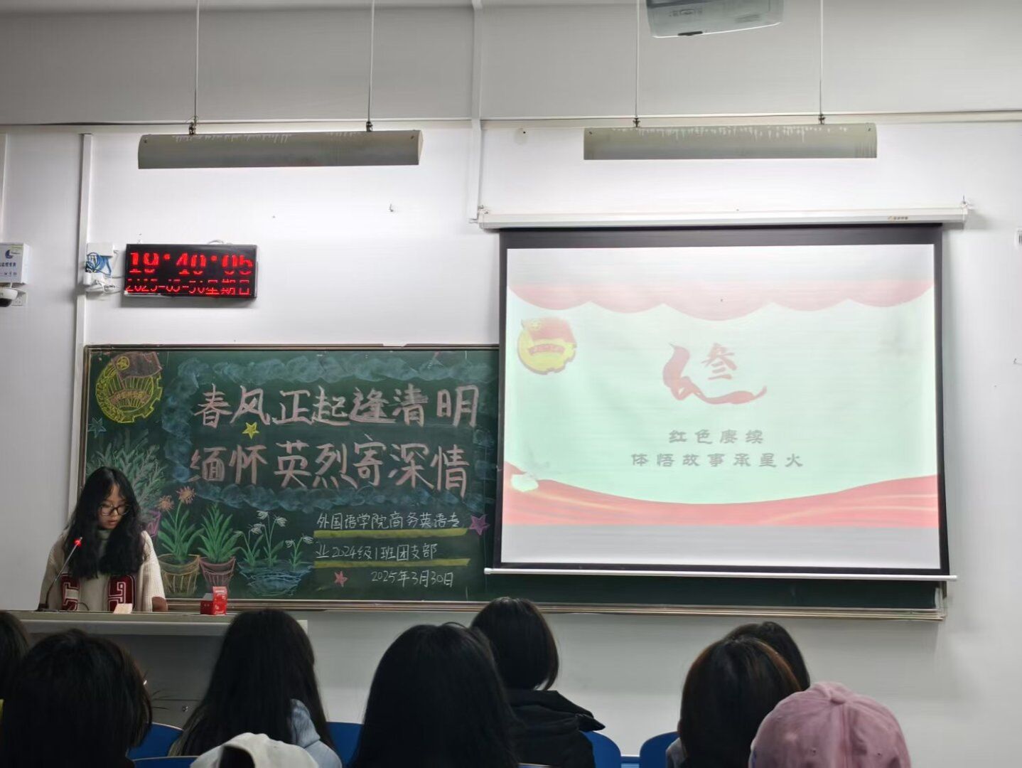 首先,各支部团支书带领同学们齐唱了中国共产主义青年团团歌,学习了习近平总书记对缅怀先烈,崇尚英雄作出的一系列重要论述,帮助同学们深刻认识国家和民族发展历程的艰辛,增强同学们对革命烈士的尊崇和民族自豪感。随后,各支部团支书带领同学们观看了《不朽的丰碑》等经典红色影片片段,帮助同学们更加深入地了解党的光辉历程和先烈的英勇事迹。最后,各支部团支书引导同学们就“如何缅怀英烈,传承红色精神”为话题展开了讨论,同学们积极发言,并表示今后要从日常生活中的小事做起,努力学习提升自我,以实际行动传承英烈们的爱国精神,成为有理想、有责任、有担当的新时代青年,为社会发展贡献自己的力量。