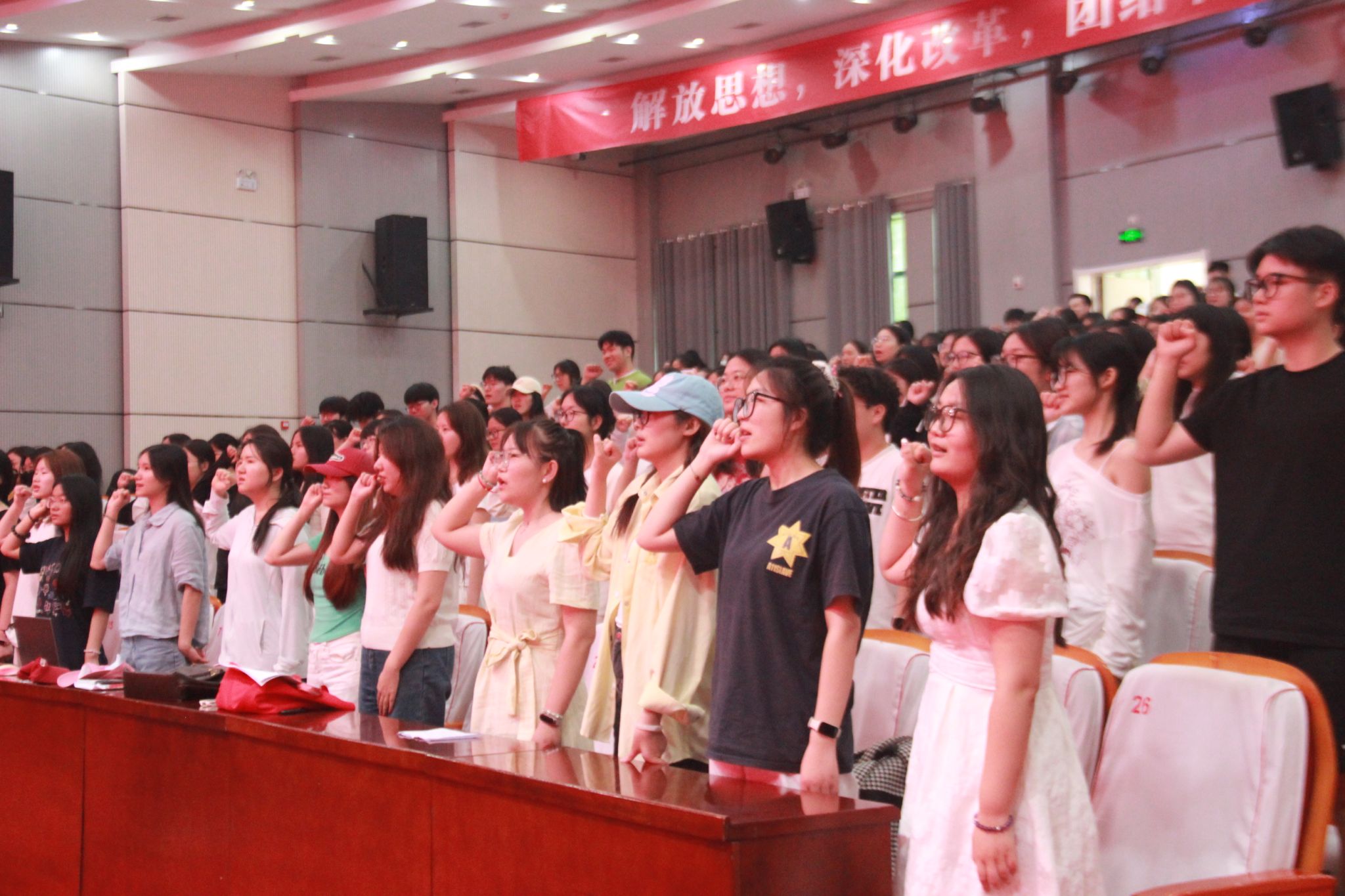 会议上,甘泉结合当前就业形势和外语学科发展前景强调了考研对于提升个人竞争力、拓宽职业发展道路的重要性,并指导同学们如何制定科学的学习计划和复习策略。他鼓励同学们结合自身兴趣和职业规划,理性选择目标院校与专业,并提醒大家合理分配时间,以积极的心态面对备考过程中的挑战,充分利用校内外学习资源,为实现考研目标全力以赴。贾宏春从“为什么考研”这一根本问题切入,详细分析了考研带来的长远优势。她鼓励同学们在选择专业时要结合自身兴趣与学科优势,确立清晰的目标,并从选校方法、复习计划制定、各科目学习技巧等方面分享实用备考策略,帮助同学们理清考研思路,明确行动方向。另外,王梦瑶结合备考过程中的常见问题,向同学们提出了三点建议:一是要明确目标导向,让自己的努力更具指向性;二是要认识到考研是一场“持久战”,同学们必须制定周密且可持续的计划;三是要保持良好心态,学会调节压力,以积极乐观的态度面对考研过程中的挑战。此外,考取福建师范大学口译专业研究生的2021级陈君杰学长也向同学们分享了自己的考研经验,他从生活作息、学习方法等方面建议同学们,备考过程中既要保证规律的生活节奏,也要制定适合自己的高效学习策略。这些经验有助于同学们更清晰地把握备考方向,优化学习策略。随后,即将参与考研的冯雨悦同学代表2022级全体同学进行了表态发言,她表达了自己对考研的坚定决心和积极态度,并表示会将本次会议中的宝贵经验与建议内化于心,外化于行。会议最后,全体参会学生起立,共同进行了庄严的考研誓师仪式,用洪亮的声音喊出了自己考研的决心和信心。