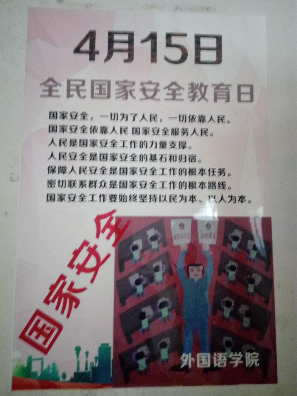2018年4月15日,迎来了中华民族共和国的第三个全民国家安全教育日。我院为了加深当代大学生对《中华人民共和国反间谍法》和《中华人民共和国国家安全法》的了解,增强当代大学生的国家安全意识,于4月26日晚上七点在图书馆615举办了全民国家安全教育主题班会。