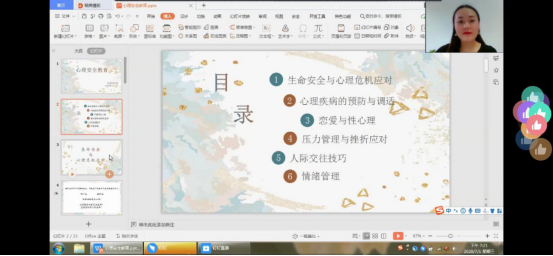 首先,牛乐平老师说明了此次主题班会的目的与重要性。然后,牛乐平老师就这次主题班会对生命安全与心理危机应对、心理疾病的预防与调适、恋爱与性心理、压力管理与挫折应对等多个方面的问题,给同学们举了许多例子,并对存在的问题,与同学们一起讨论解决的方法,最后给同学们总结了许多正确的解决措施。在这个过程中,同学们都认真听讲,并就一些问题提出自己的观点和看法。