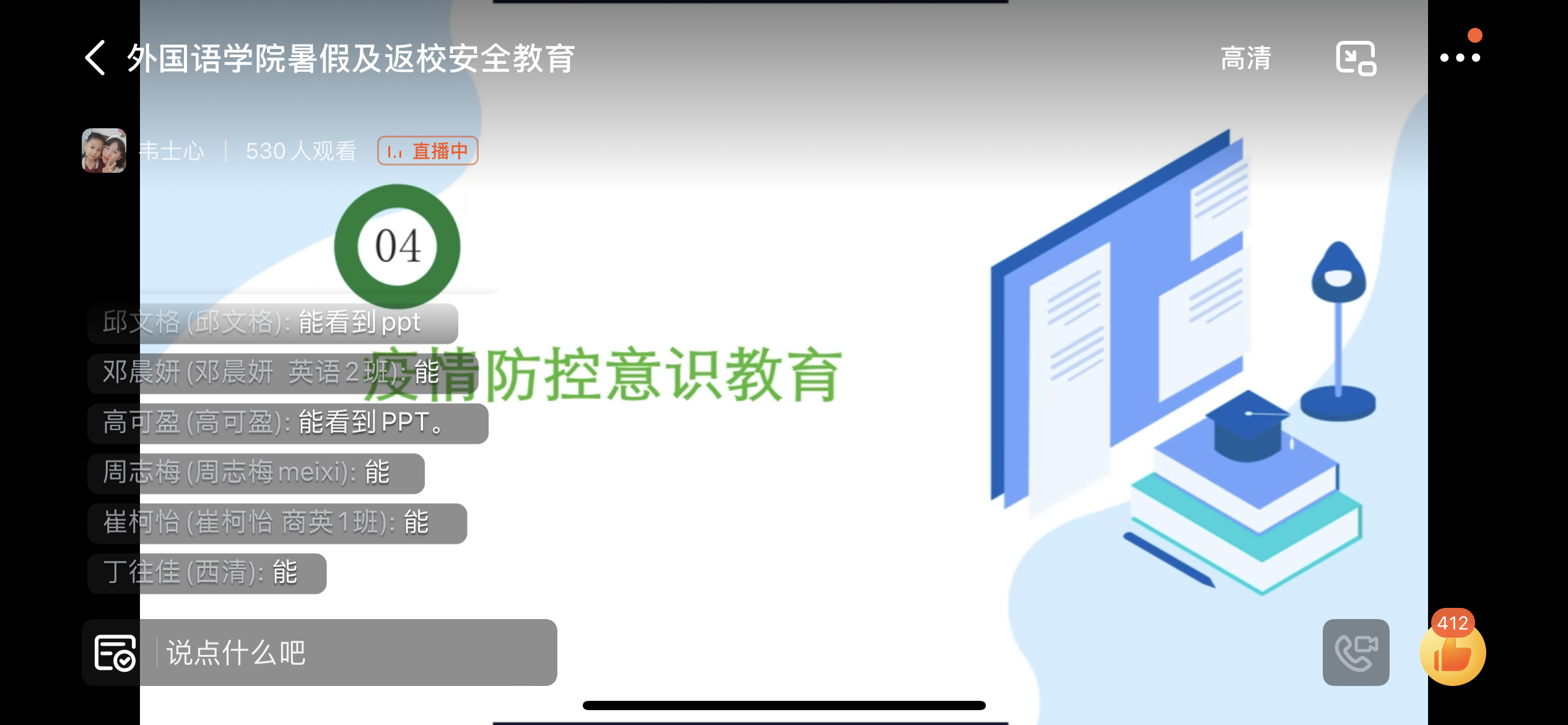 为切实做好大学生暑期安全教育工作,提高学生安全防范意识,增强学生应急避险的能力,8月17日,122cc太阳成集团通过钉钉直播的方式,召开暑期安全教育主题班会。本次班会由122cc太阳成集团辅导员韦士心主讲,122cc太阳成集团全体学生参加。