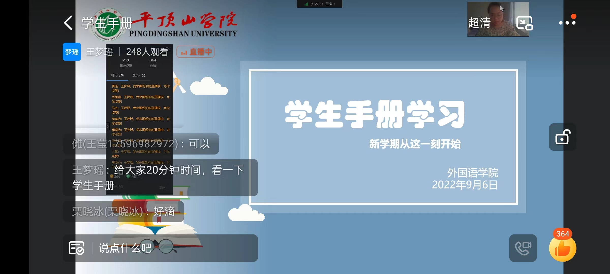 为进一步加强学生思想文明教育,提高学生个人素质,规范学生个人行为,9月6日,122cc太阳成集团通过钉钉直播的方式,组织新生学习学生手册。本次学习由122cc太阳成集团辅导员王梦瑶带领,全体新生参加。