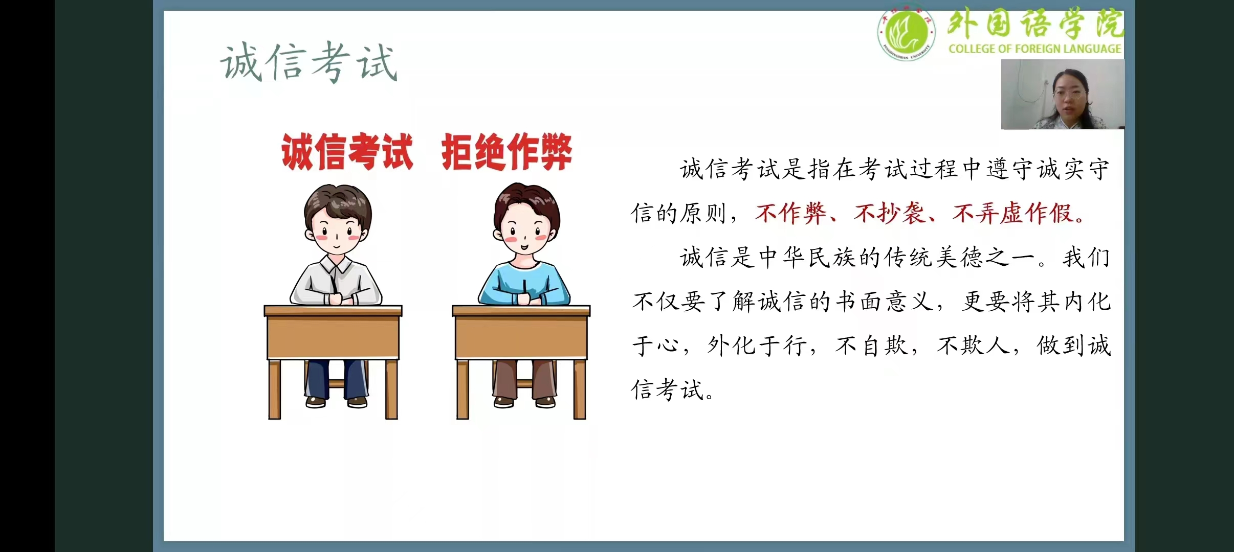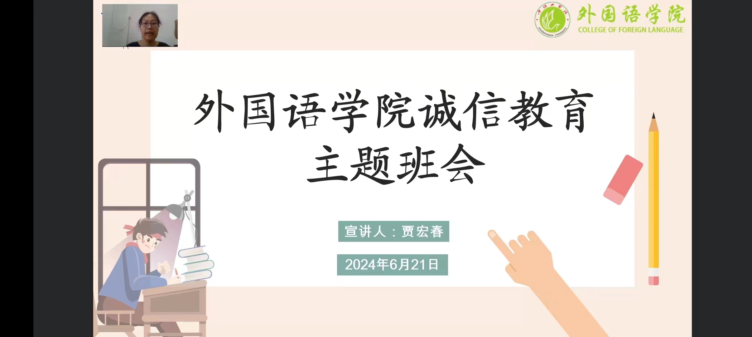 为加强同学们的诚信意识,引导同学们树立正确的考试观念,增强同学们的考前心理调适能力,6月21日上午,122cc太阳成集团通过钉钉线上直播的方式召开了诚信教育主题班会暨考前压力疏导会。本次会议由122cc太阳成集团副院长贾宏春、2022级辅导员王梦瑶主讲,122cc太阳成集团2021级、2022级、2023级全体同学参加。
