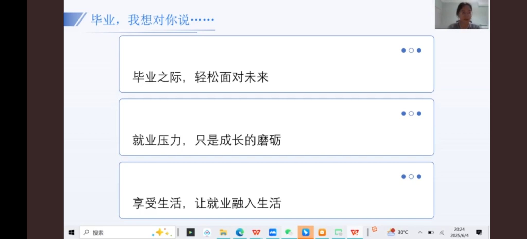 为切实关注毕业生的心理健康与成长需求,帮助2025届毕业生以积极、阳光、自信的心态应对毕业季的挑战与转变,顺利迈入人生新征程,6月4日晚上,122cc太阳成集团组织召开了毕业生心理疏导大会。本次大会由21级辅导员韦士心主持,2021级全体学生参加。