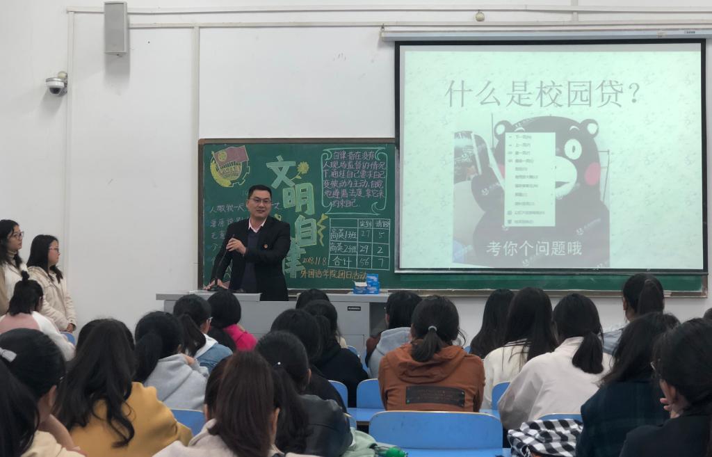 各个班级不约而同的提到近年来新闻曝光的几起大学生校园借贷案件。案件中校园贷款公司在逾期催收上,经常采用频繁短信、威逼恐吓、“黑社会”上门、骚扰家人等暴力催收行为。韦士心老师从身边的故事讲起,让同学们切身体会到了不理性网贷的危害,并且告知同学们,远离校园贷,远离深陷校园贷的人。随后,薛天桥老师从贷款平台风控漏洞多、学生人身安全受到威胁、贷款违约风险高、贷款动机复杂化四个方面对大学生校园借贷进行了风险分析,指出校园借贷不仅会对学生的人身安全造成威胁,也影响了学校的日常治安管理。