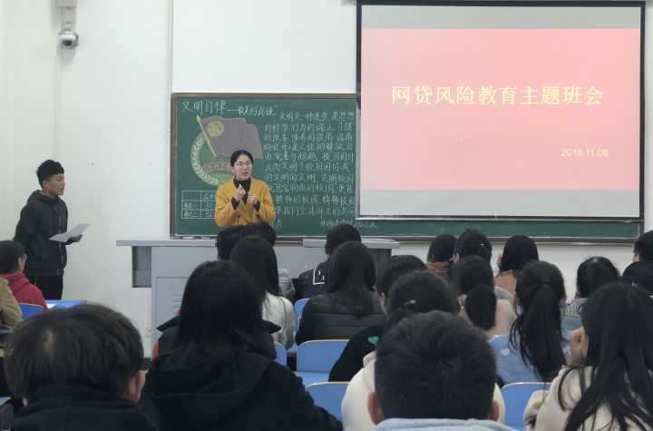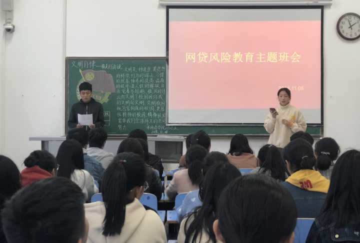 为了消除校园不良网络贷款引发的借贷隐患和债务悲剧的发生,加强社会主义核心价值观教育,营造崇尚节约的校园文化环境,帮助同学们养成文明、健康的生活习惯,提高安全防范意识,自觉远离网络借贷行为,规避盲目消费风险,11月8日下午,122cc太阳成集团学院全体行政班级开展了以“理性消费,拒绝网贷”为主题的班会,院学工办主任薛天桥、辅导员韦士心参与了此次班会。