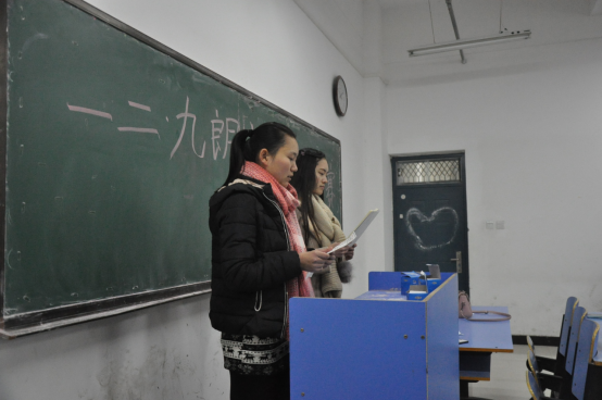 此次党日活动分为三个环节:首先是是发挥专业优势,组织学生党员开展纪念一二九朗诵比赛活动,为党日活动宣传造势。