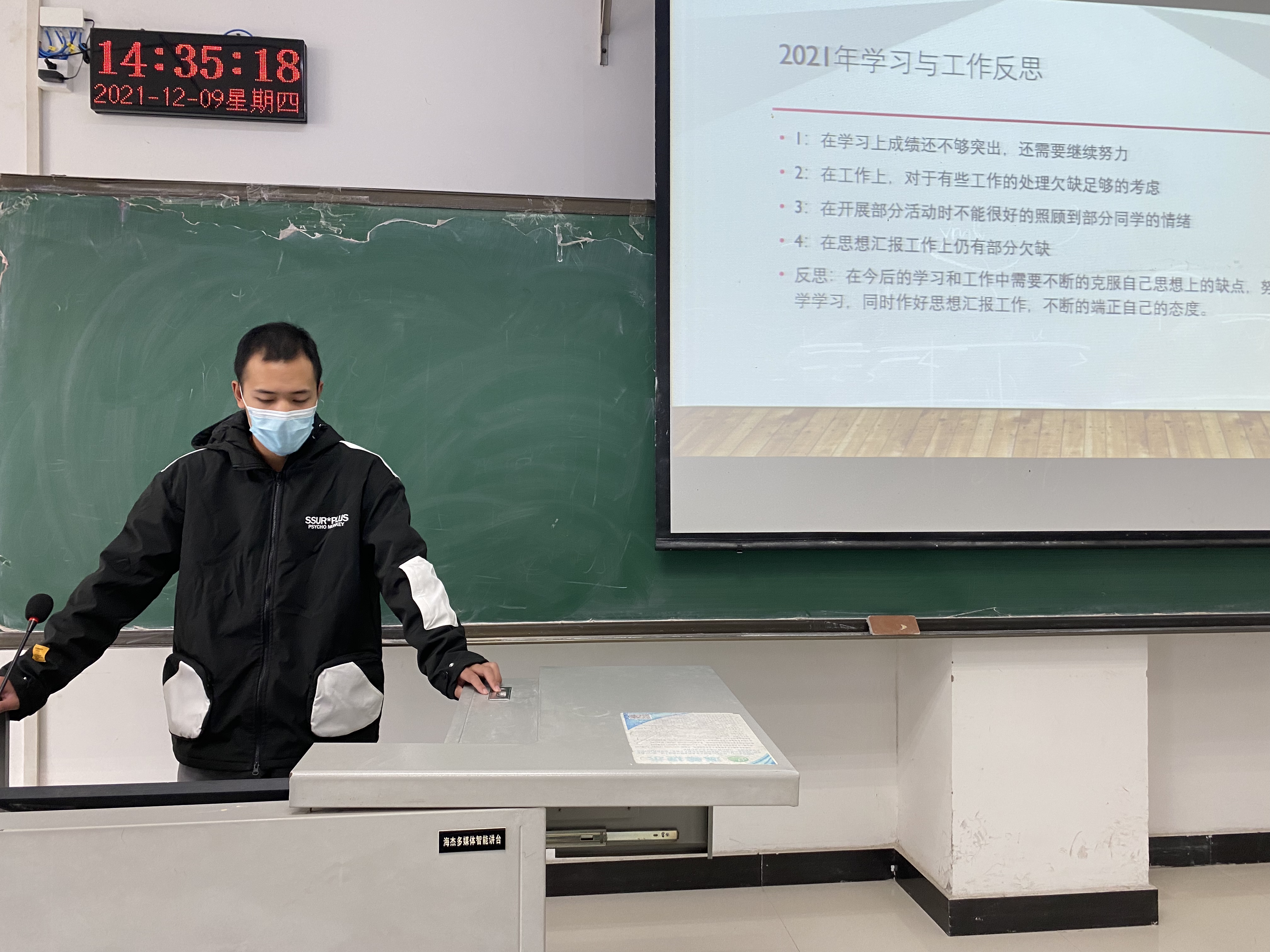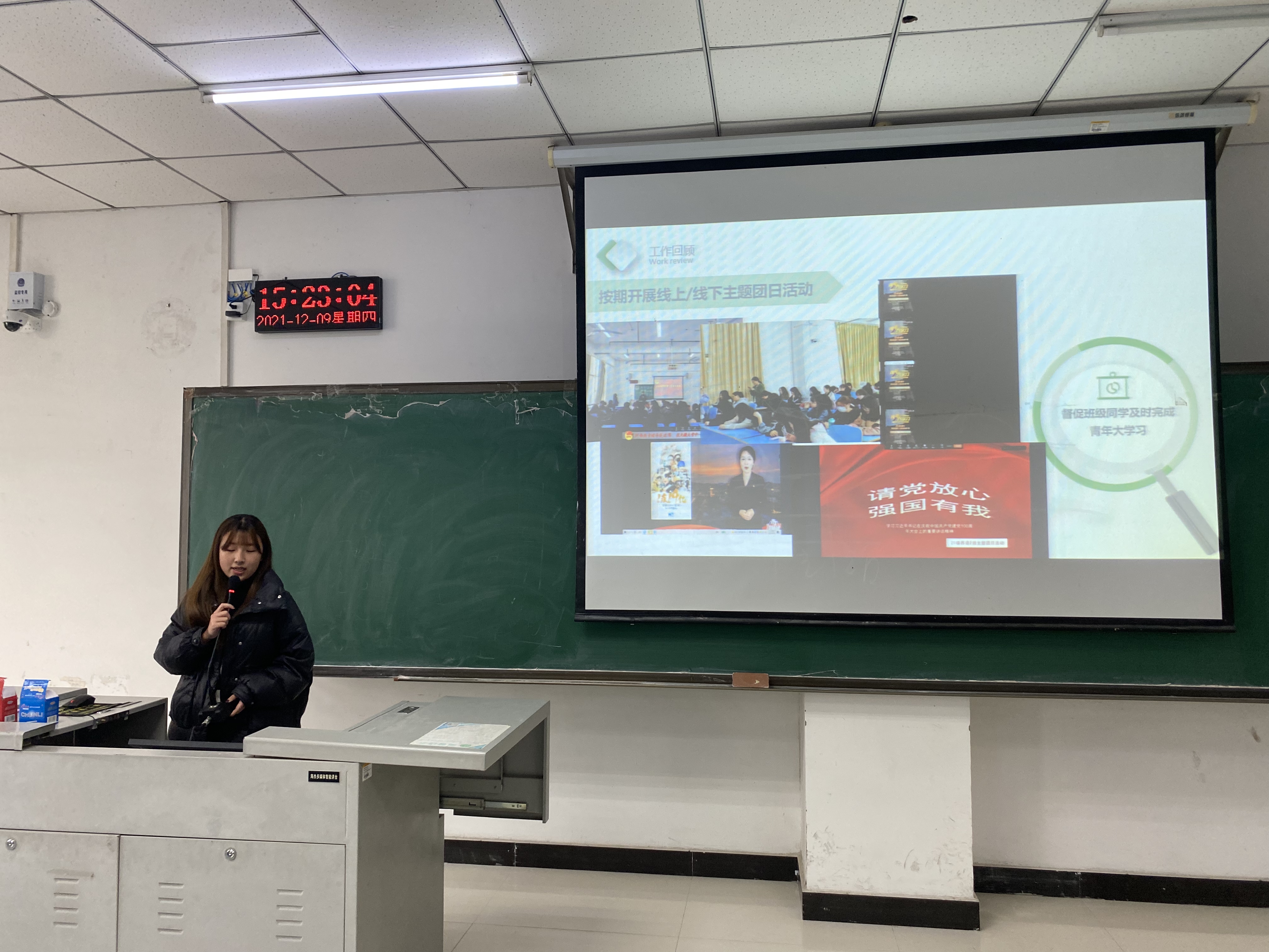 会上,各班团支书依次以ppt形式,全面、客观地介绍了各支部本学期在加强青年引领、支部组织建设、服务青年和提升支部素养等方面的工作开展情况。从工作实践中总结成绩和经验,找出不足,对过去的工作做出结论同时做好下学期团支部的计划。述职结束,参会人员对团支部书记进行了评议。袁立文对本次召开的基层团支部述职评议大会给予了充分的肯定,对各班述职的团支书提出了意见与建议,期望日后能顺利开展团支部的各项组织活动。韦士心强调了各支部需按要求完成“智慧团建”系统的记录的重要性并要求各班团支书督促班级同学积极参与青年大学习。