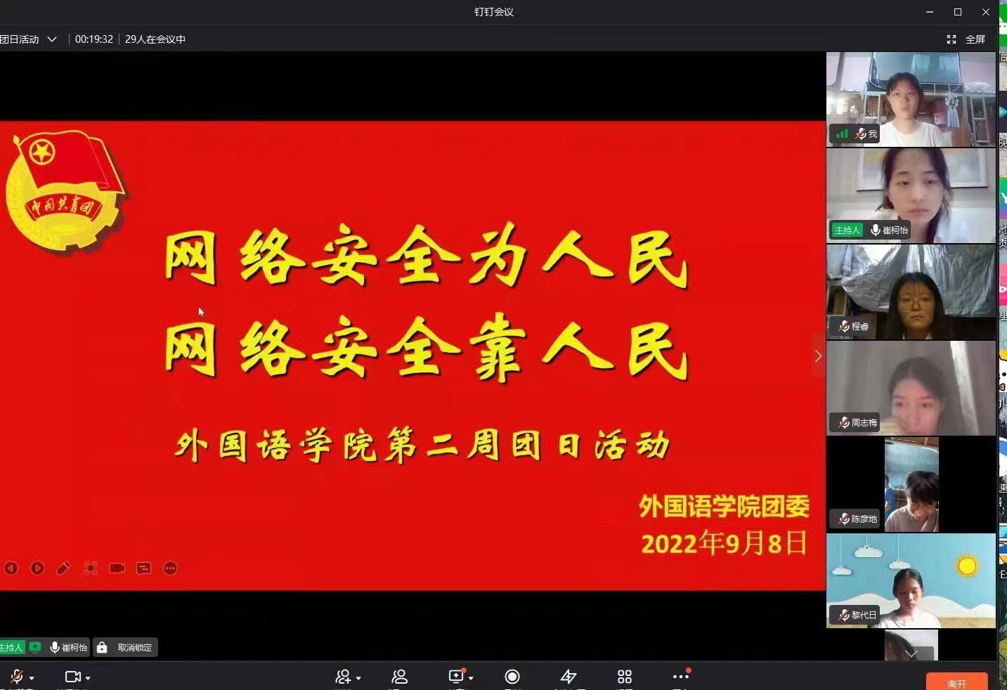 为贯彻落实“培育和践行社会主义核心价值观”的理论,进一步宣传习近平法治思想,普及法律知识,弘扬法治精神,9月8日下午,122cc太阳成集团各支部通过钉钉线上的方式开展了以“强化核心价值观教育,争做遵纪守法好青年”和“网络安全为人民,网络安全靠人民”为主题的团日活动。本次团日活动由各班团支书主持召开。
