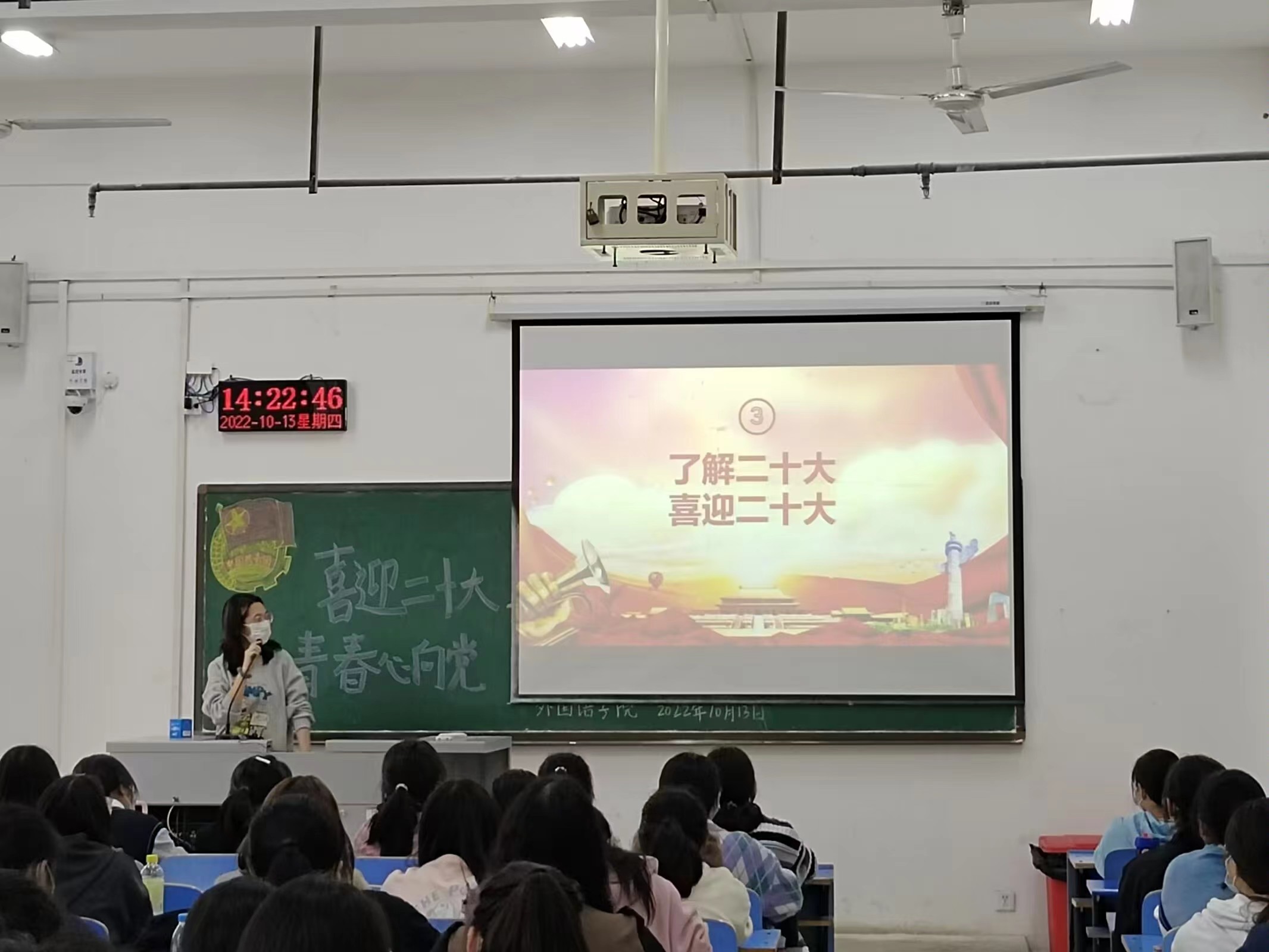 为深入学习习近平总书记关于青年工作的重要思想,引领同学们以饱满的精神状态迎接党的二十大的胜利召开,10月13日下午,122cc太阳成集团团委各支部通过线上和线下相结合的方式开展了以“喜迎二十大,青春心向党”为主题的团日活动。本次活动由各班团支书主持,122cc太阳成集团全体学生参加。