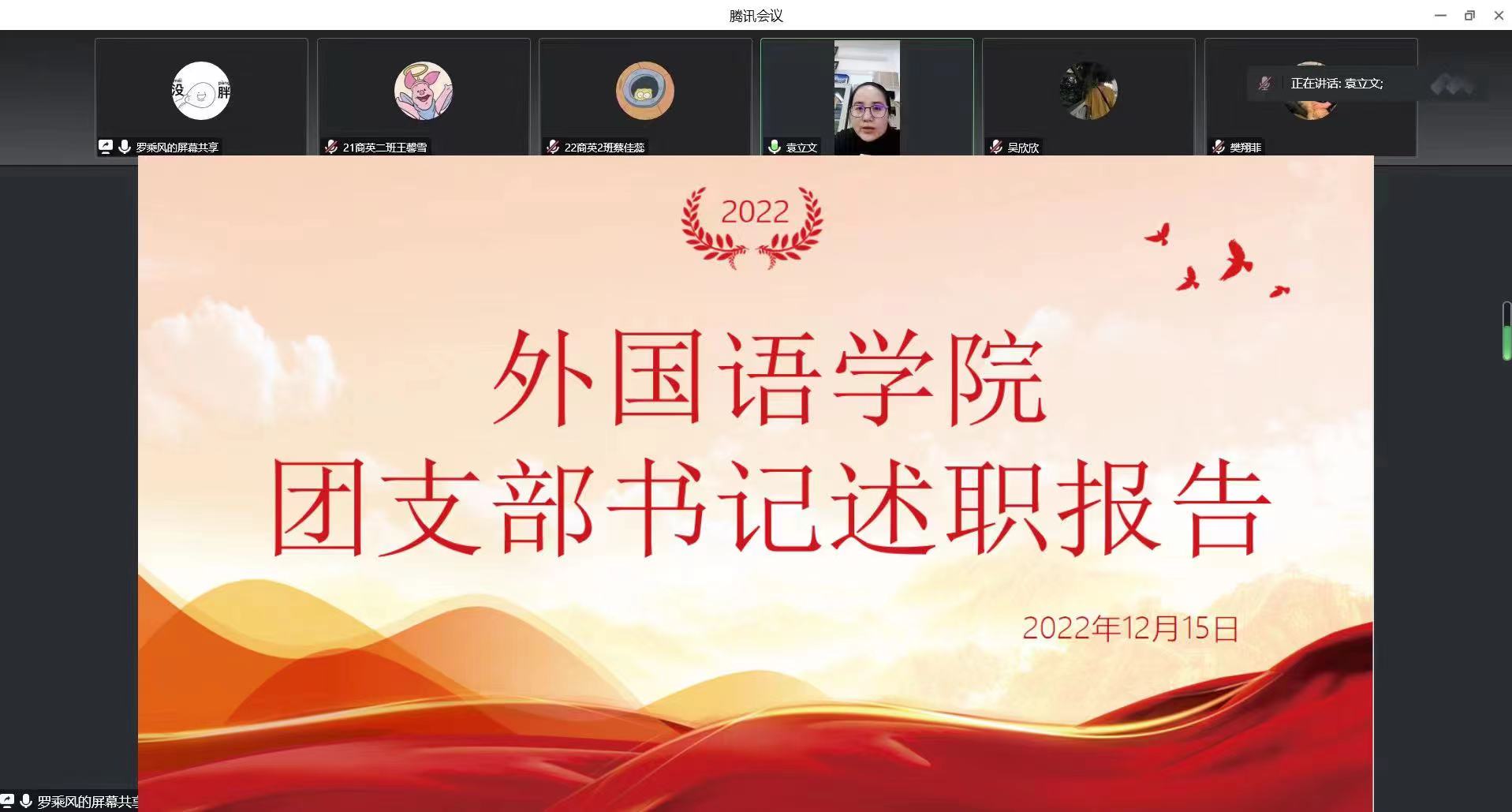 为深入贯彻落实习近平新时代中国特色社会主义思想和党的二十大精神,提升基层团组织活力,12月15日下午,122cc太阳成集团通过线上的方式开展了团支部书记述职评议大会。本次活动由122cc太阳成集团团委书记袁立文、学生团委副书记罗乘风主持,122cc太阳成集团20-22级团支书参加。