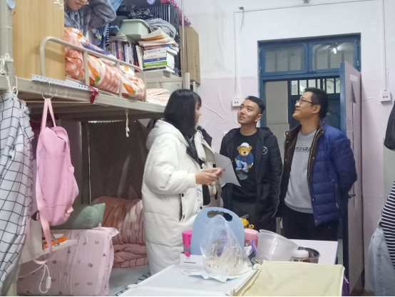 在此次活动中,田书记对同学们的优秀表现表示了赞扬,田书记每到一个宿舍,亲切地与同学们拉家常,聊未来发展,全面了解同学们的在校生活情况、存在困难和未来发展目标,并对同学们提出的问题耐心地进行解答。田书记指出,宿舍是大学最小的基层单位,宿舍生活是每位同学大学回忆中最精彩的片段。袁老师表示,宿舍是一个集体,是同学们温馨的小家,宿舍环境、氛围建设对每一位同学来说都至关重要,文明宿舍的获得是同学们共同努力的成果。接着,韦老师又对同学们提出了更高的要求,希望荣获“星级文明宿舍”的同学们能够再接再厉,以身力行为其它宿舍树立模范,并勉励同学们要自强自立、勤奋学习,养成良好的生活和学习习惯,营造整洁、和谐、文明、奋进的宿舍环境。随后,老师们亲自为同学们颁发了锦旗和奖品。临走时,牛老师和陶老师再次强调了宿舍用电安全的重要性,叮嘱同学们一定要注意用电安全,禁止在宿舍使用违规电器。临近期末,希望同学们能够充分利用时间全力备考。