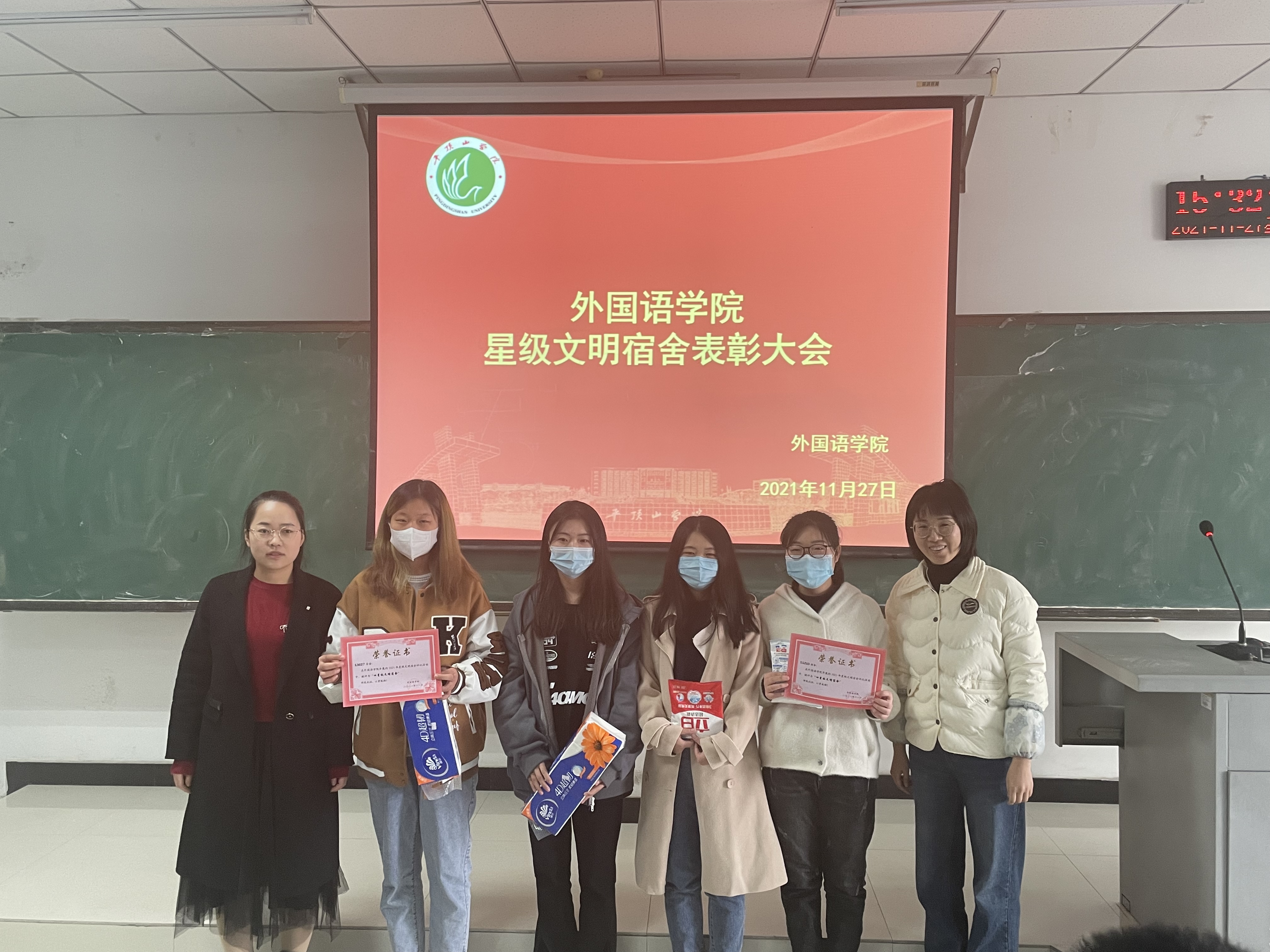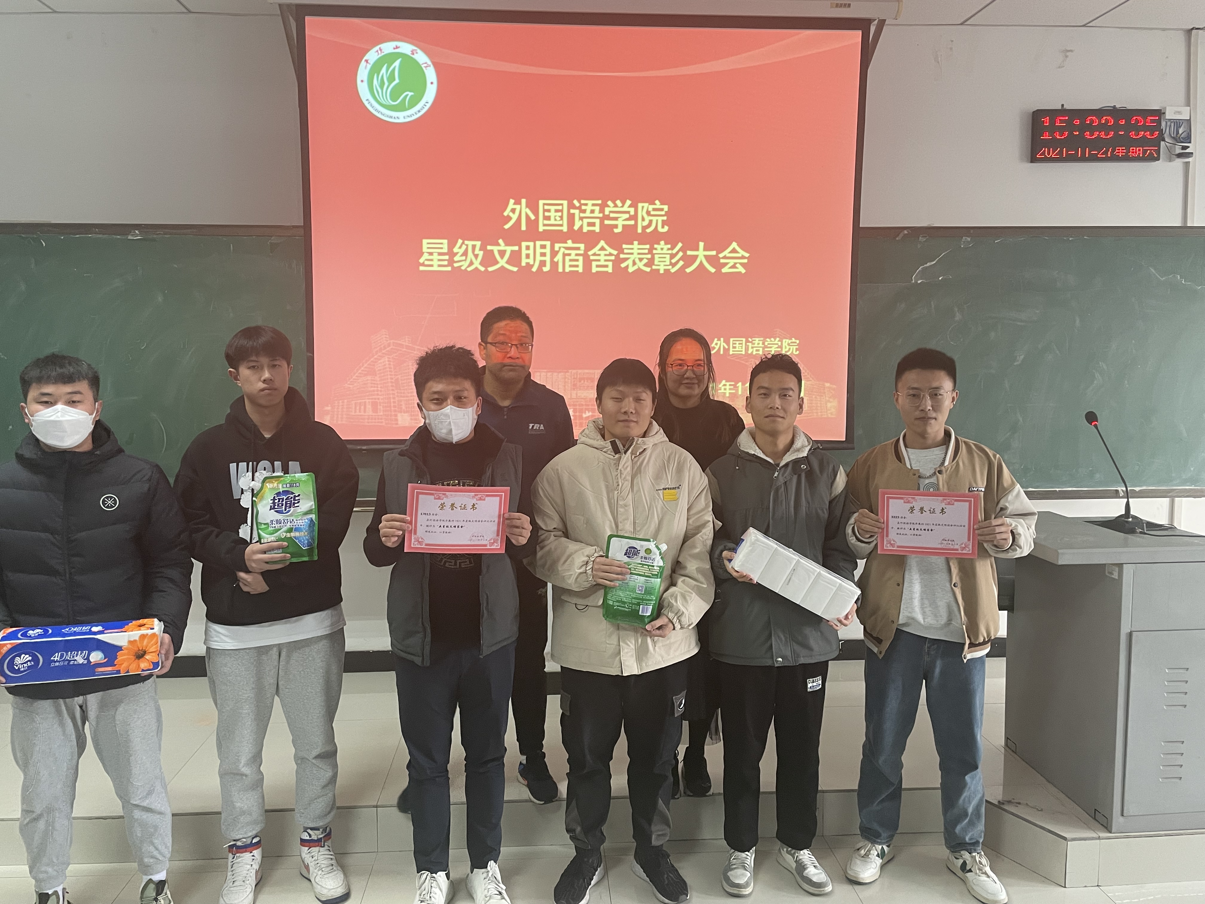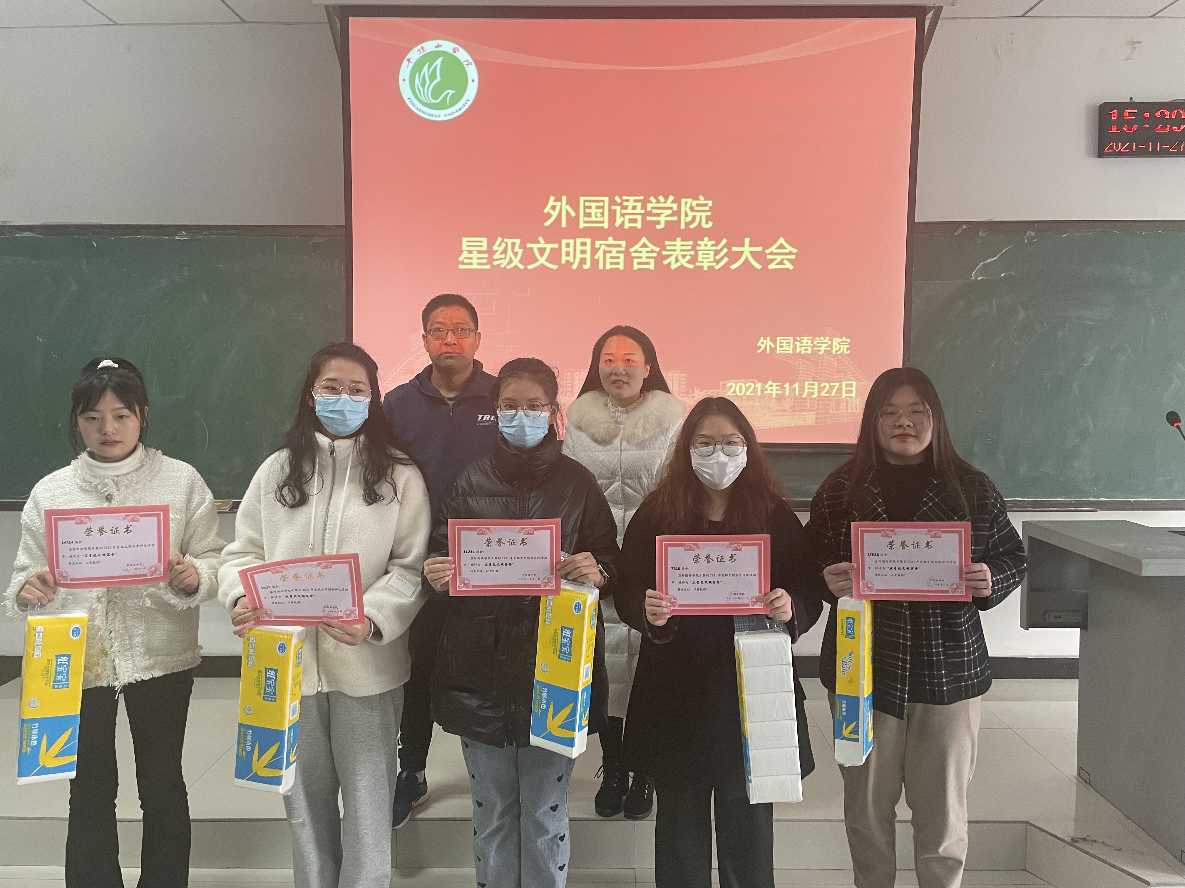 本次星级文明宿舍评比活动由生活权益部与各班生活委员联合检查评分,从寝室内务,室内外卫生,寝室成员是否遵守校规校纪、是否和谐文明等方面进行综合考核评比,共评选出五星级文明宿舍24个、四星级文明宿舍33个、三星级文明宿舍47个。各位老师为到场的“星级文明宿舍”代表颁发了奖状和奖品,为避免聚集,会后,分别将其余奖状和奖品送到其他获奖的星级文明宿舍。