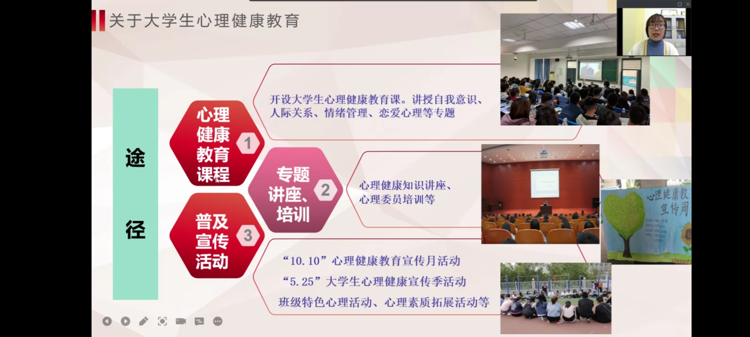 为做好大学生心理健康教育工作,培养大学生良好的心理素质,增长学生心理健康知识和心理调试技巧,11月4日下午,122cc太阳成集团于钉钉群开展“助人自助,共同成长”为主题的线上心理健康教育培训。本次心理健康教育培训由大学生心理教育咨询中心张孟曼老师主持,全体21级新生参加此次培训。