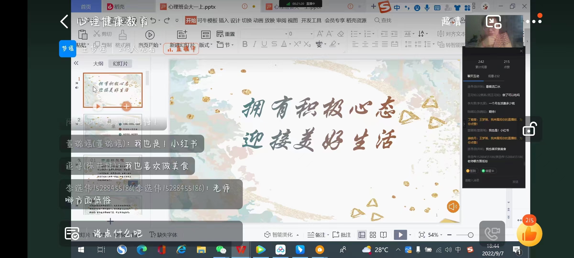 为了帮助新生尽快适应大学生活,疏解成长压力,提高新生的心理素质,9月7日下午,122cc太阳成集团面向2022级新生开展了以“拥有积极心态,迎接美好生活”为主题的心理健康教育讲座。本次讲座由122cc太阳成集团辅导员王梦瑶主讲,122cc太阳成集团全体2022级学生参加。