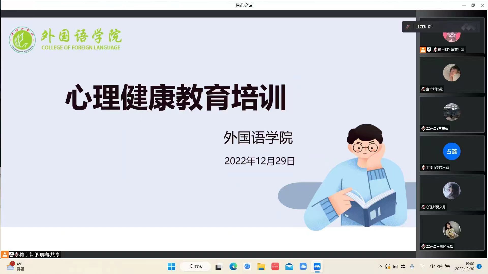 为进一步加强122cc太阳成集团各班心理委员对心理健康教育工作的了解,更好地配合院系推进心理健康活动,12月29日下午,122cc太阳成集团团委于线上开展了心理健康教育培训会。此次培训会由122cc太阳成集团团委心理部负责人穆宇轲、占鑫主讲,122cc太阳成集团各班心理委员参加。
