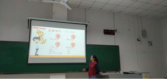 招聘会上,招聘单位首先通过播放宣传片,PPT展示等动态方式像同学们介绍公司的概况,职业发展方向、人员需求以及选择该单位的理由等。接着,该招聘单位负责人又向同学们详细介绍了该单位的薪资福利,即可带薪培训、入职即缴纳五险+医疗保险、可带薪寒暑假等一系列优厚福利,向同学们展现了他们真挚的招聘诚意。随后,招聘单位负责人又提出了他们的应聘要求,招聘方希望应聘者能够吃苦耐劳,有责任心,专业知识扎实有一定的社会经验,并表示他们十分愿意提供一个平台让同学们能够有机会能够锻炼自己,成就自己。最后,招聘单位负责人向同学们分享了公司的未来规划,表示将加大学校发展力度,不断提升学校的硬件和软件设施,从而为职员提供更广阔的展示平台和发展机会,让同学们感受到了该公司的发展前景的广阔,对该公司未来的发展方向有了更加清晰的认识。