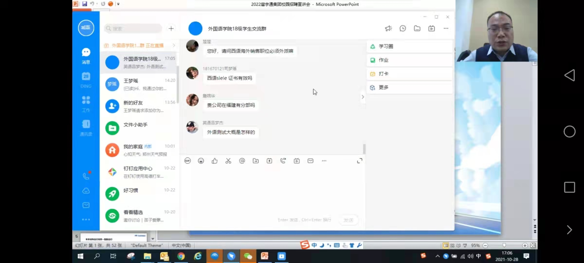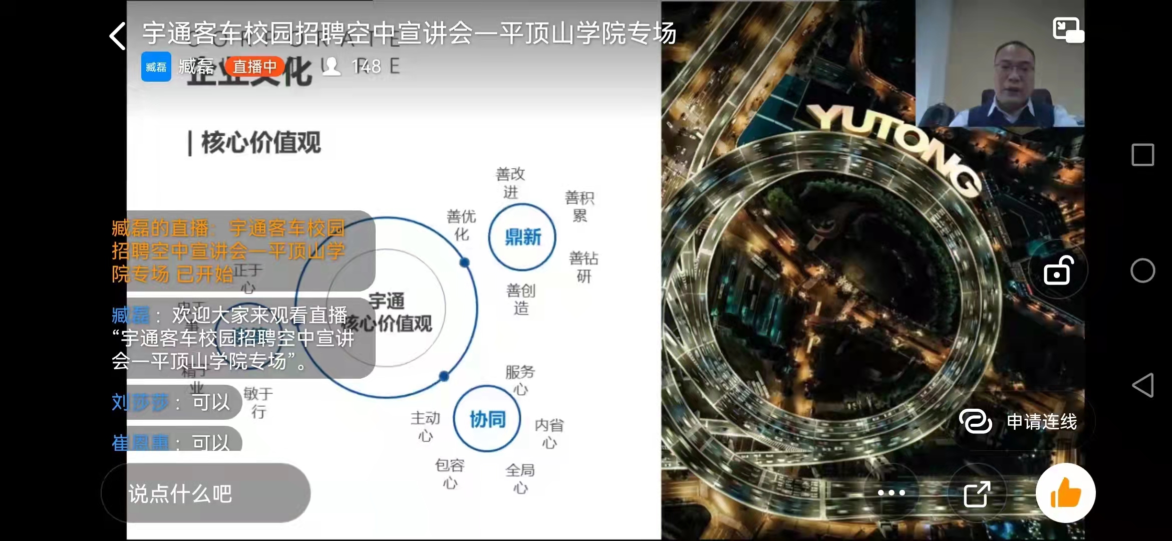 为切实做好122cc太阳成集团毕业生的就业工作,构建毕业生与用人单位的交流平台,为毕业生提供精准、有效的就业信息和就业服务。10月28日下午,我院于钉钉平台召开宇通集团2022届校园招聘宣讲会。本次招聘会邀请到了宇通集团海外人力资源部负责人臧磊经理为18级学生主讲,18级辅导员老师王梦瑶及122cc太阳成集团全体2022届毕业生参加了此次会议。