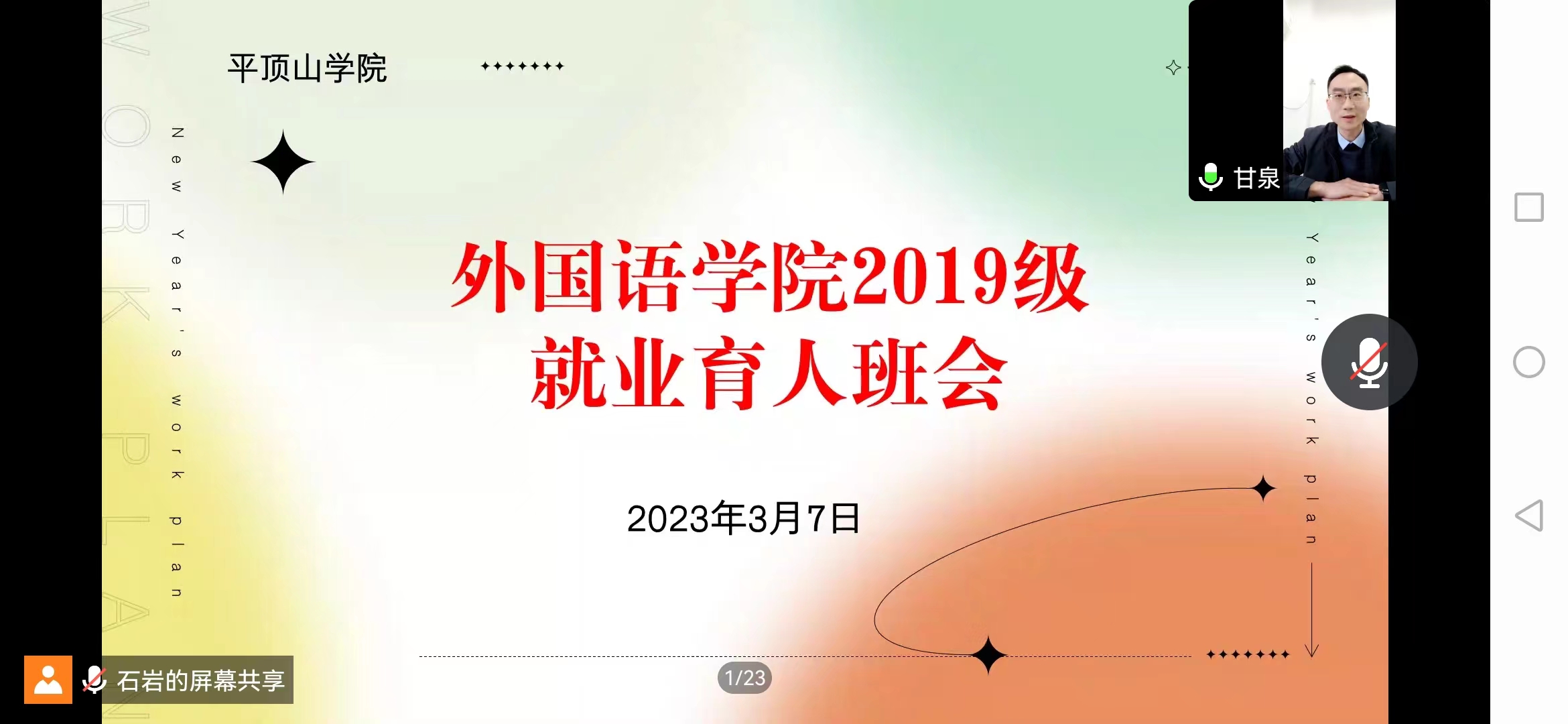 为做好122cc太阳成集团2023届毕业生就业工作,帮助同学们了解就业形势,掌握就业政策,促进毕业生高质量就业,2023年3月7日,122cc太阳成集团通过腾讯会议方式举行就业育人班会。此次会议由毕业生辅导员石岩主持,学院党委书记甘泉、党委副书记田占范主讲,以及2019级全体学生参与此次育人班会。