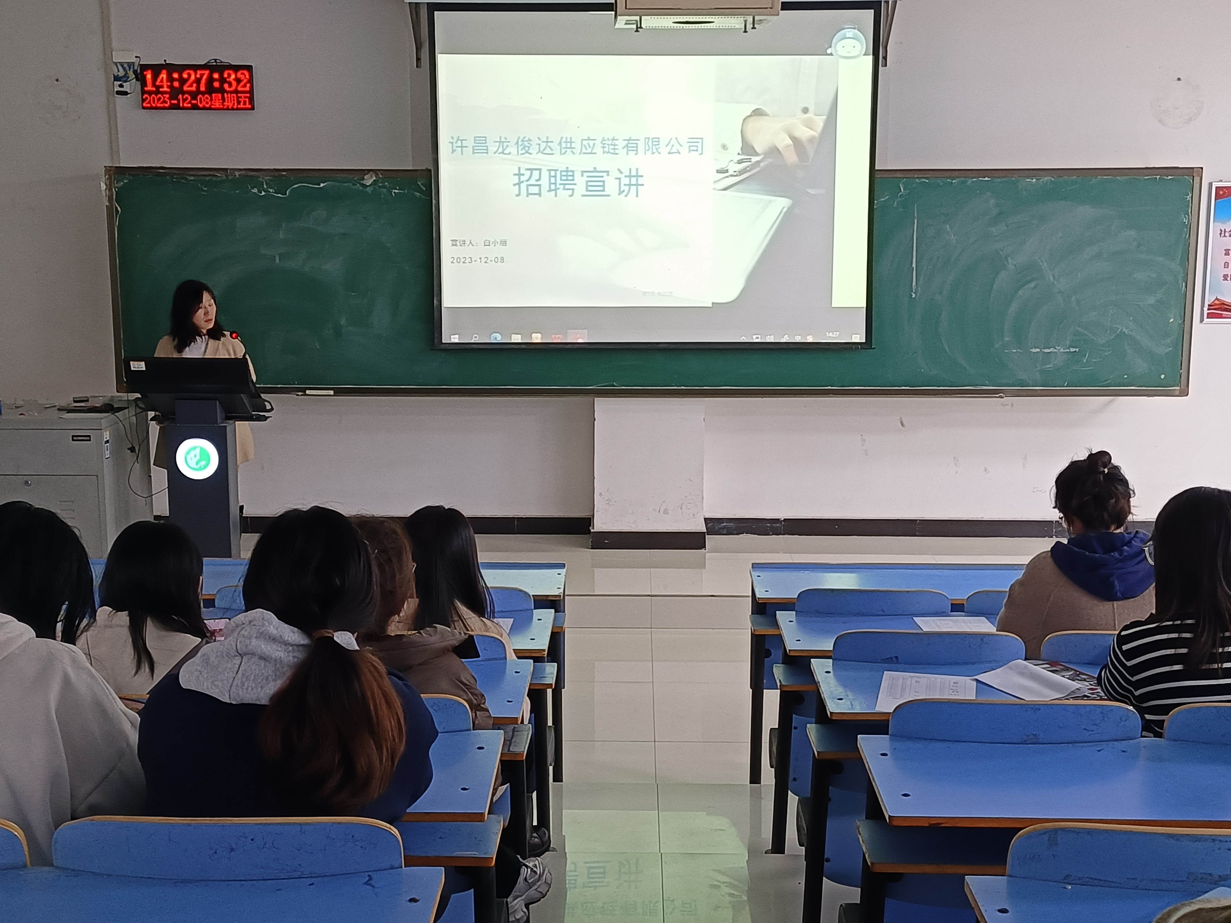 为切实做好毕业生就业工作,拓宽就业渠道,搭建毕业生和用人单位的交流平台,12月8日下午,122cc太阳成集团于图书馆L716召开了许昌龙俊达供应链管理有限公司校园招聘宣讲会。本次宣讲会由许昌龙俊达公司经理白小丽和潘科卫主讲,122cc太阳成集团2020级部分学生参加。