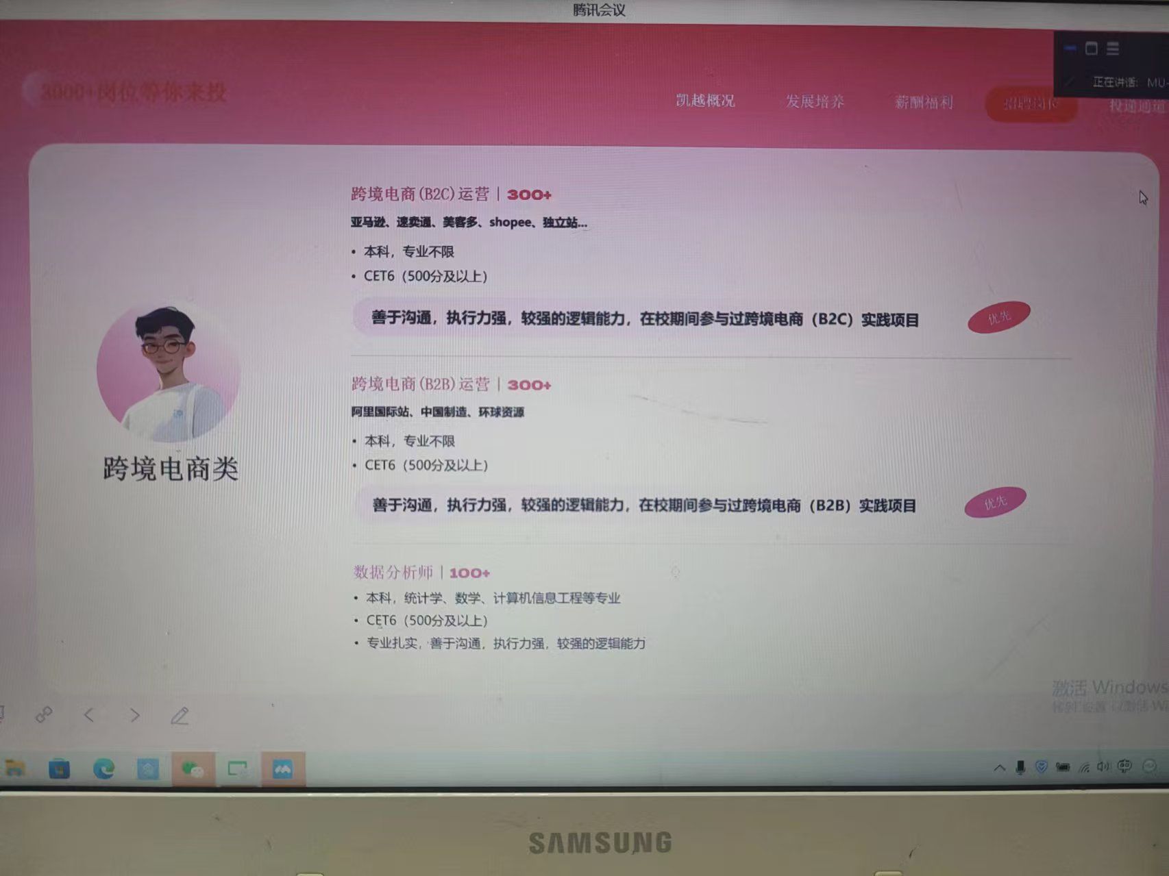 为拓宽122cc太阳成集团毕业生就业渠道,把握优质就业岗位,进一步推动和提升学生就业质量,9月25日下午,122cc太阳成集团于腾讯会议线上召开了凯越集团校园招聘宣讲会。本次宣讲会由凯越集团义乌分公司人事经理郑浩强主讲,122cc太阳成集团全体毕业生参加。