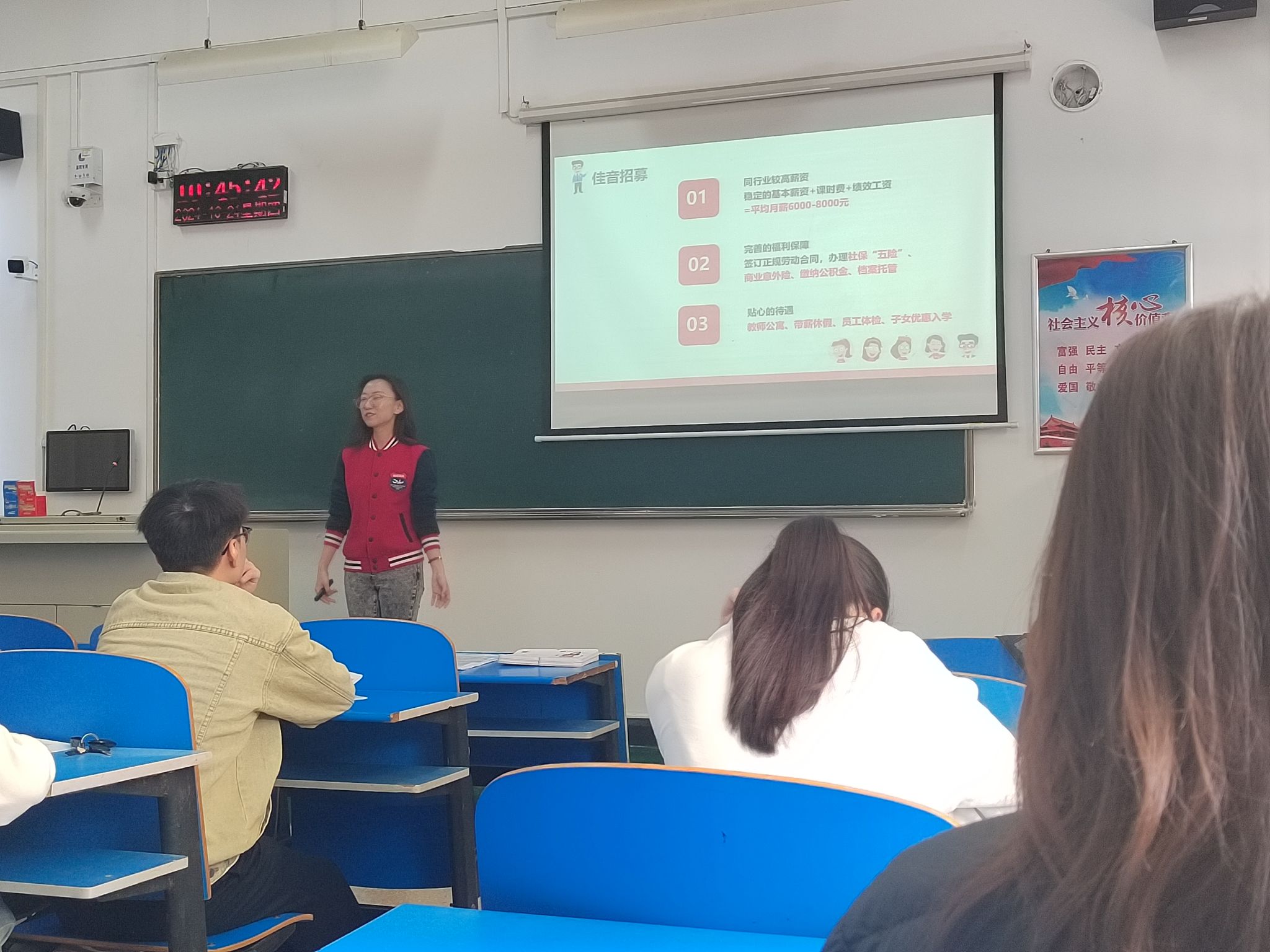 宣讲会伊始,刘晓宇从学校的发展历程、办学理念及教学特色三个方面展开向同学们简要介绍了学校的基本情况,就教学特色方面,他讲到,洛阳佳音英语培训学校作为业内知名的培训学校,一直不断升级优化教学体系,致力于为学生提供优质的英语教育服务,发展前景十分广阔。接着,刘晓宇向同学们详细介绍了本次校招的岗位需求,他表示,学校在业内口碑良好,且对外语人才需求量大,希望同学们可以综合考虑各方面因素,结合自身情况,积极投递简历。最后,刘晓宇鼓励同学们积极提出自己的疑问,并细心解答了同学们咨询的问题,帮助同学们完善对学校在招岗位的认识。会后,同学们纷纷表示,在投递简历前,会持续了解该学校的相关需求和发展方向,分析自身的优点与不足,不断提高自身竞争力,并提前规划未来发展,为就业做好充分准备。