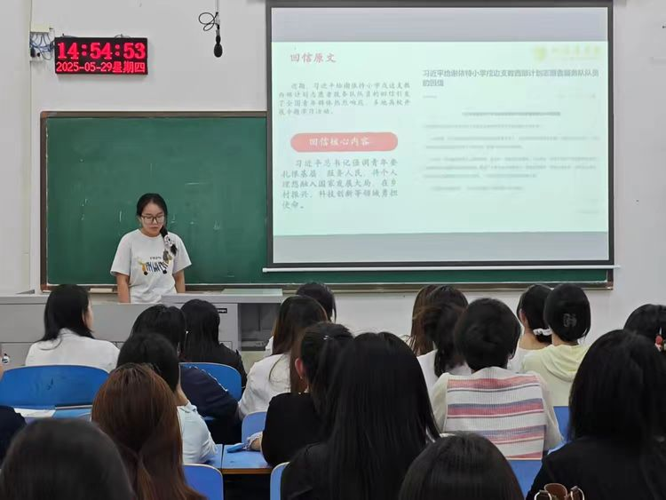 学生党员董璐瑶领学了习近平总书记给新疆克孜勒苏柯尔克孜自治州阿图什市哈拉峻乡谢依特小学戍边支教西部计划志愿者服务队全体队员回信精神。习近平总书记鼓励广大青年“到祖国和人民最需要的地方发光发热,为中国式现代化建设贡献青春力量”。她结合自身学习感受,分享了新时代青年在基层一线、艰苦地区以及国家重点领域的奋斗故事,激励学生党员树立远大理想,主动到祖国和人民最需要的地方去。
